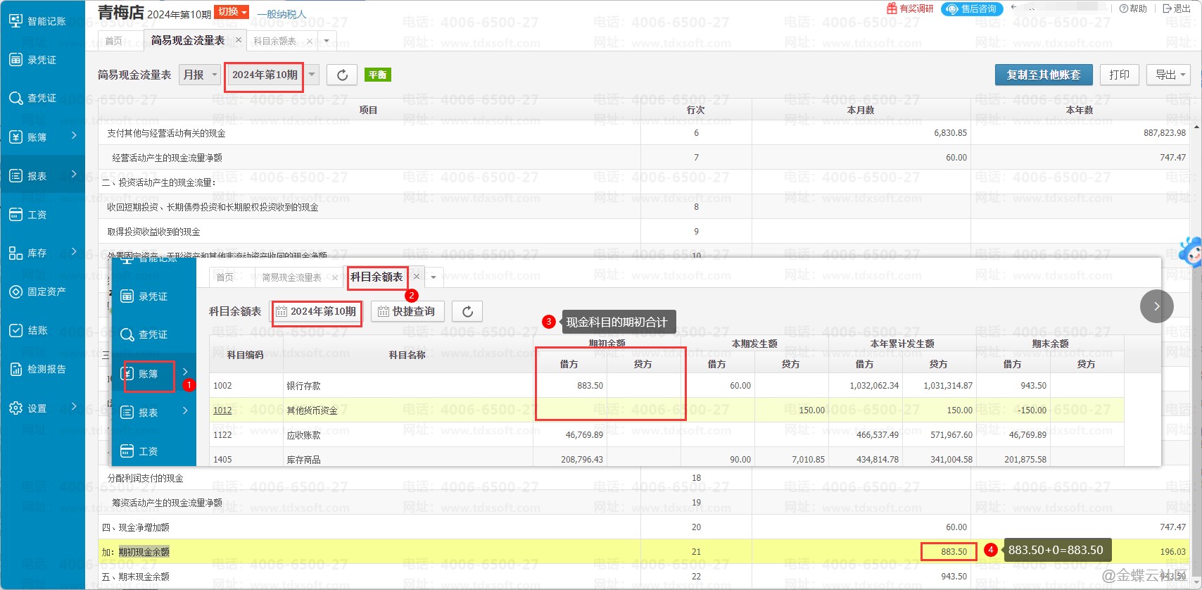 4、第21行次【期初现金余额】,本月数来源于本期现金科目的期初合计,本年数来源于上一年度12期现金科目的期末余额合计。如下图所示: