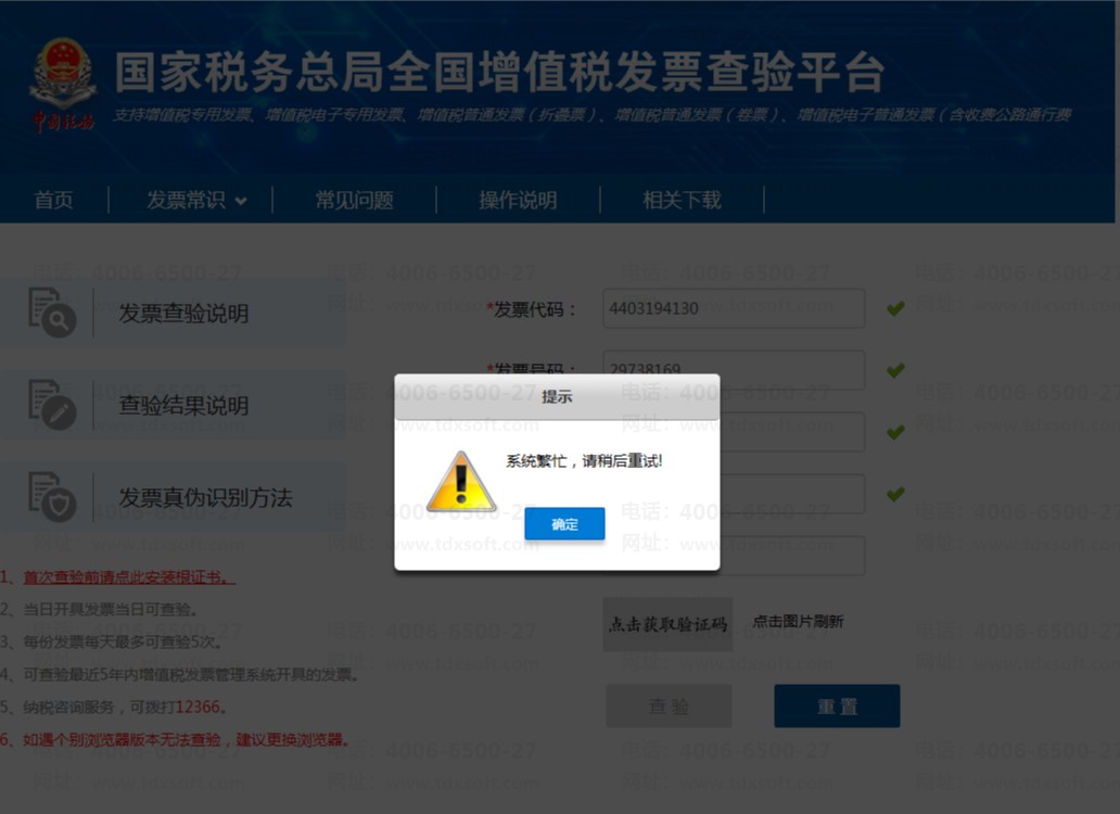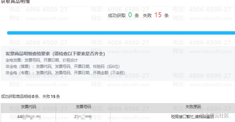 2)录入发票信息进行查验,返回下图提示语查验失败,那需要等税局系统恢复正常后才可以在我们系统正常获取商品明细