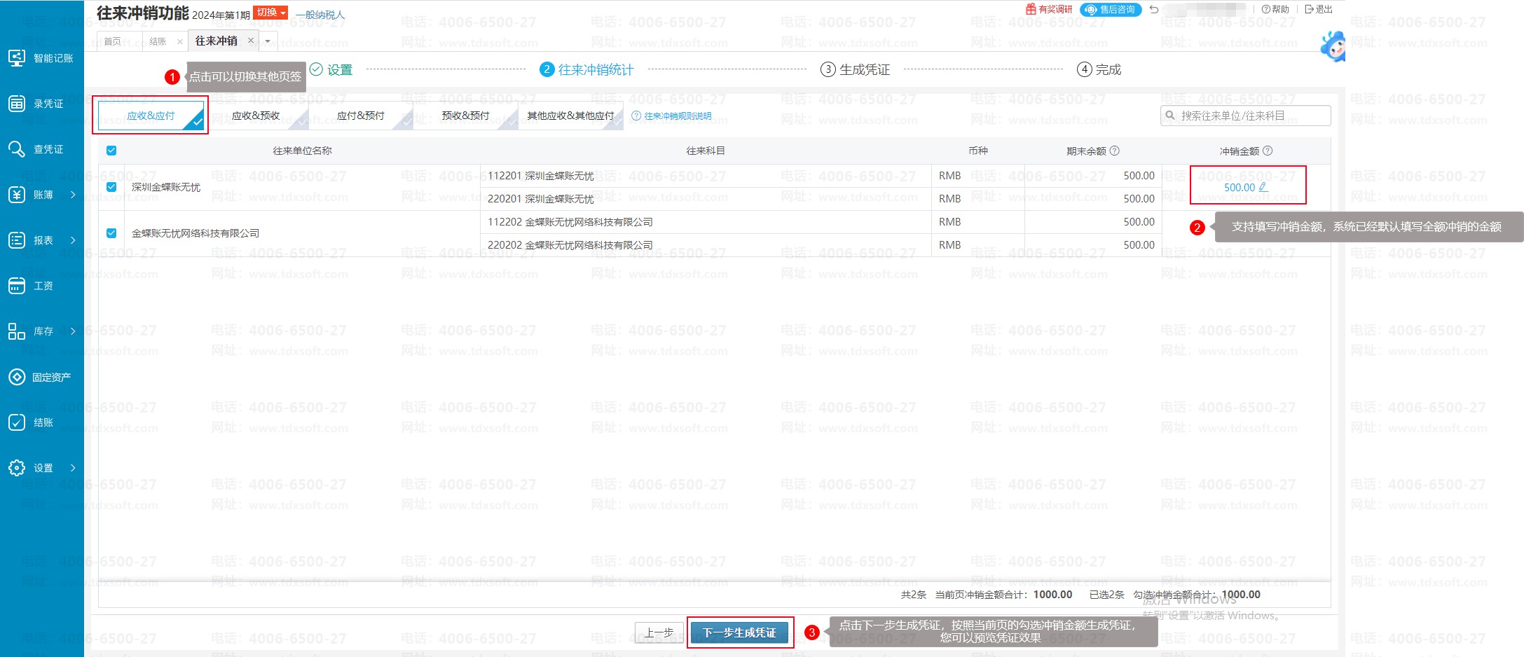(三)支持勾选想冲销的往来单位及编辑冲销金额