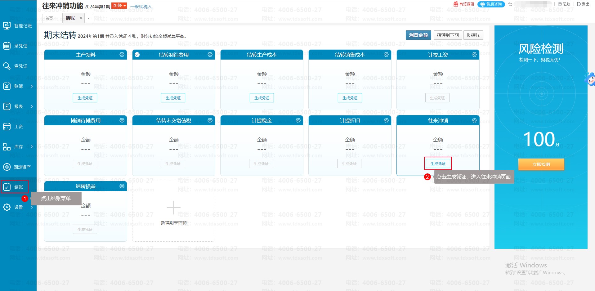 点击【结账】菜单,找到往来冲销卡片,点击【生成凭证】,进入往来冲销页面;