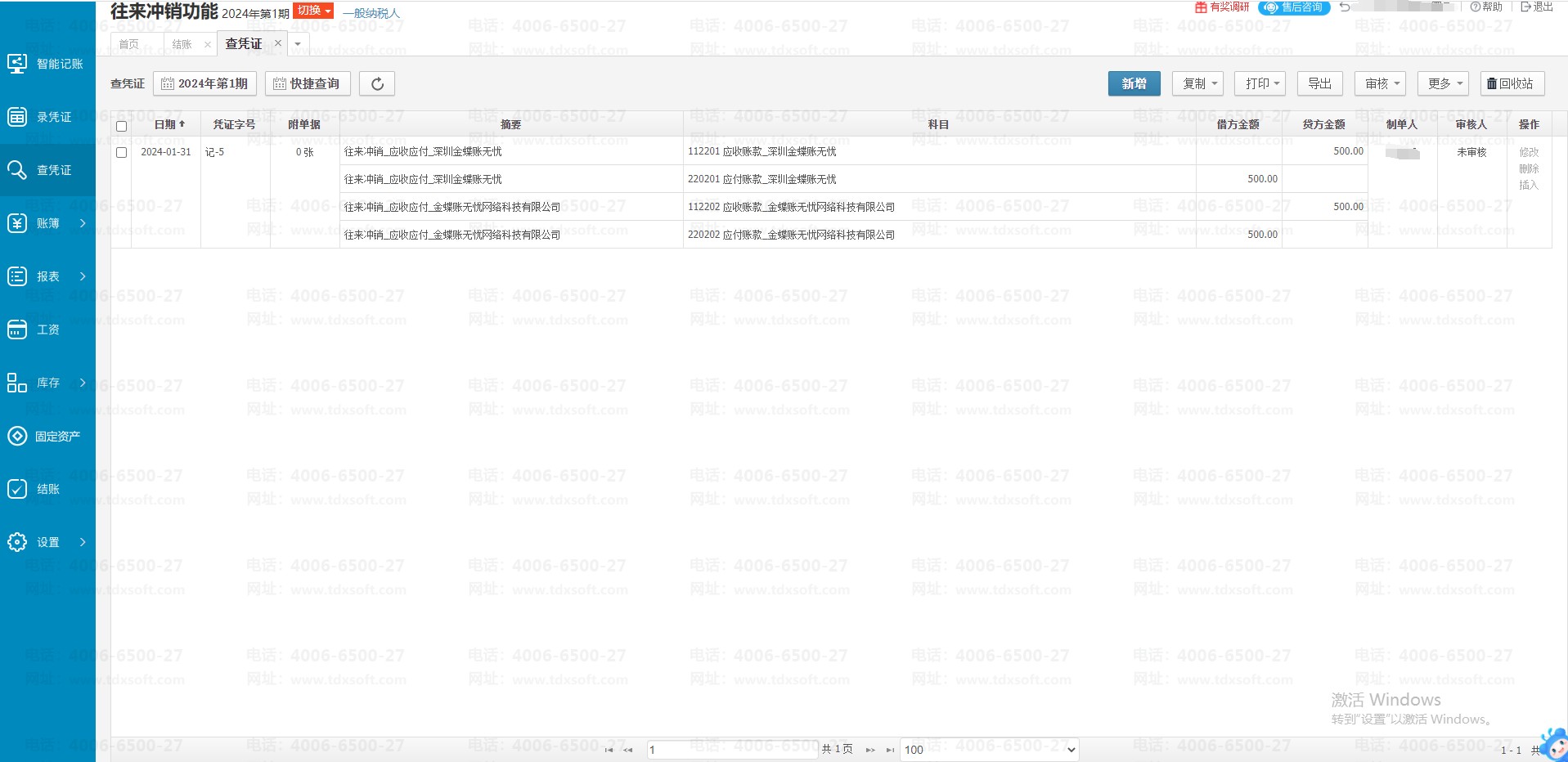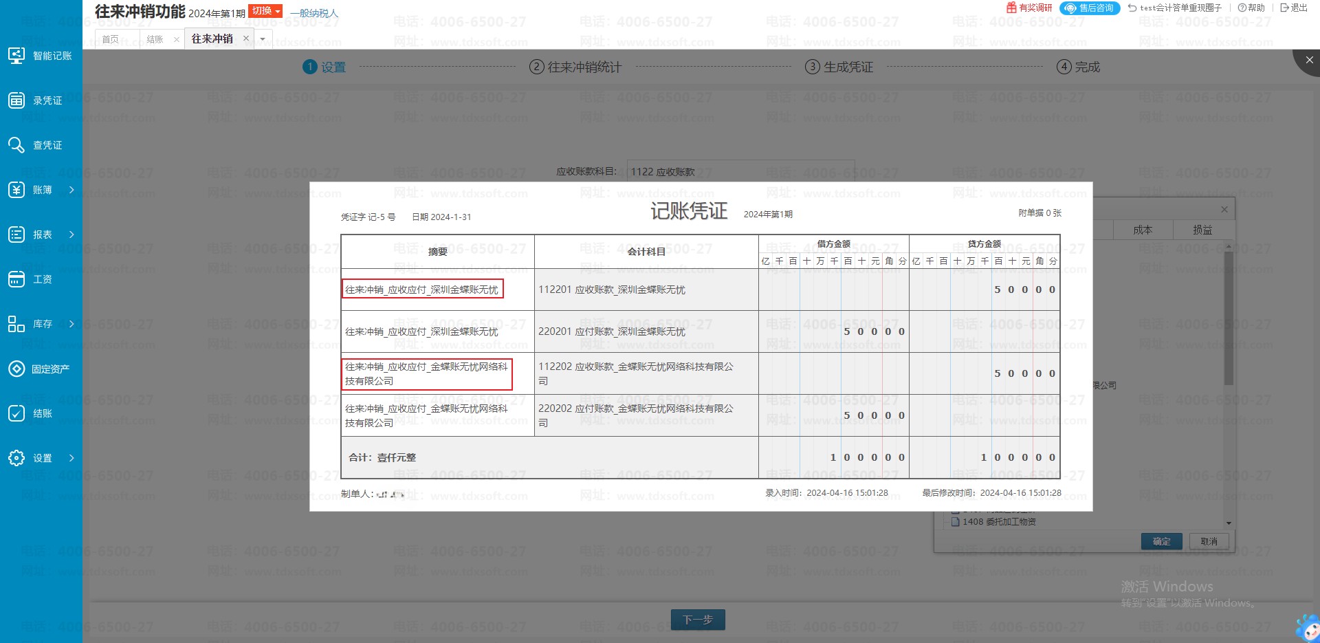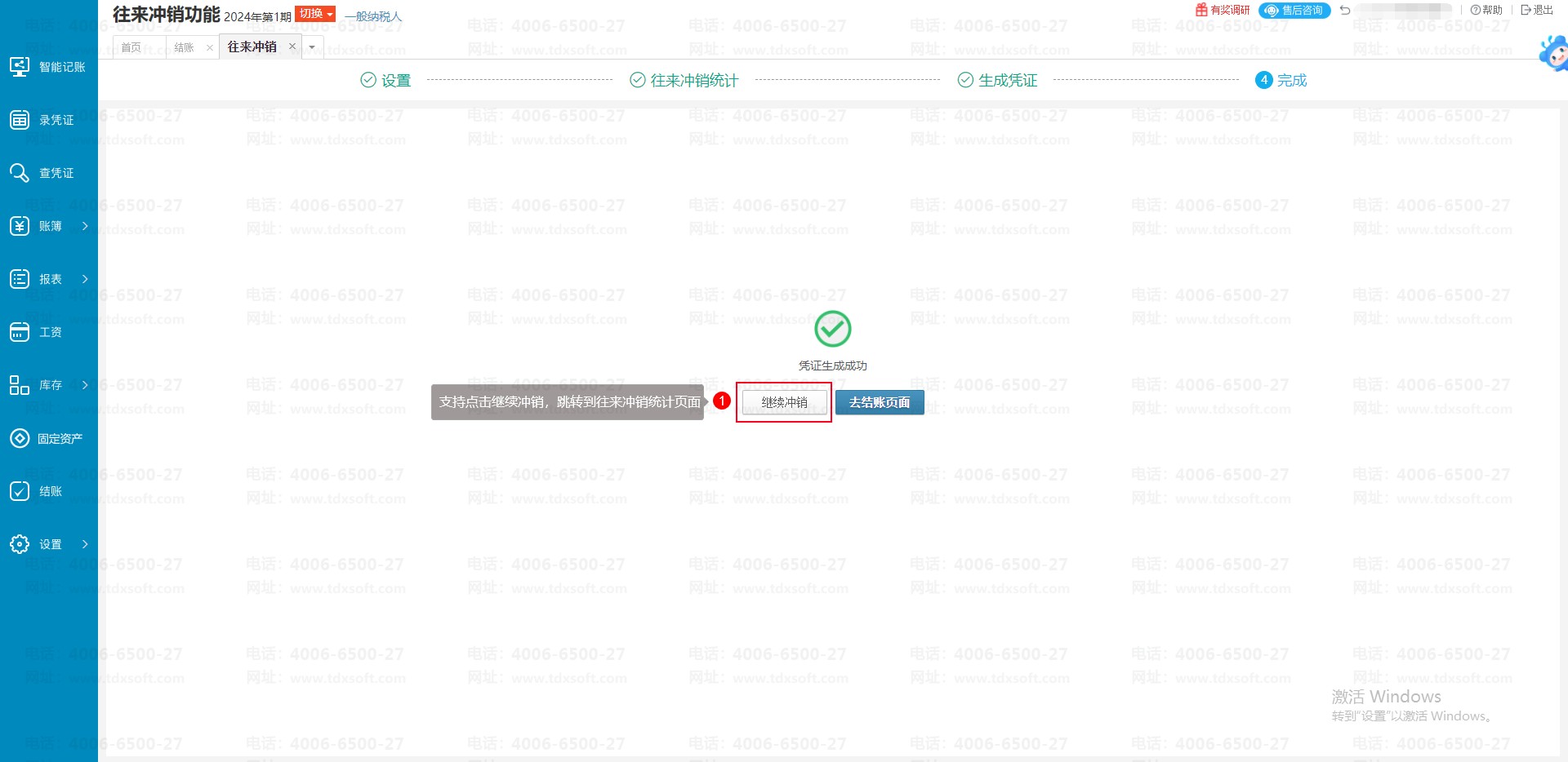 凭证生成成功,您可以点击【继续冲销】,返回到往来冲销统计页面,可以对其他页签的往来单位继续冲销;