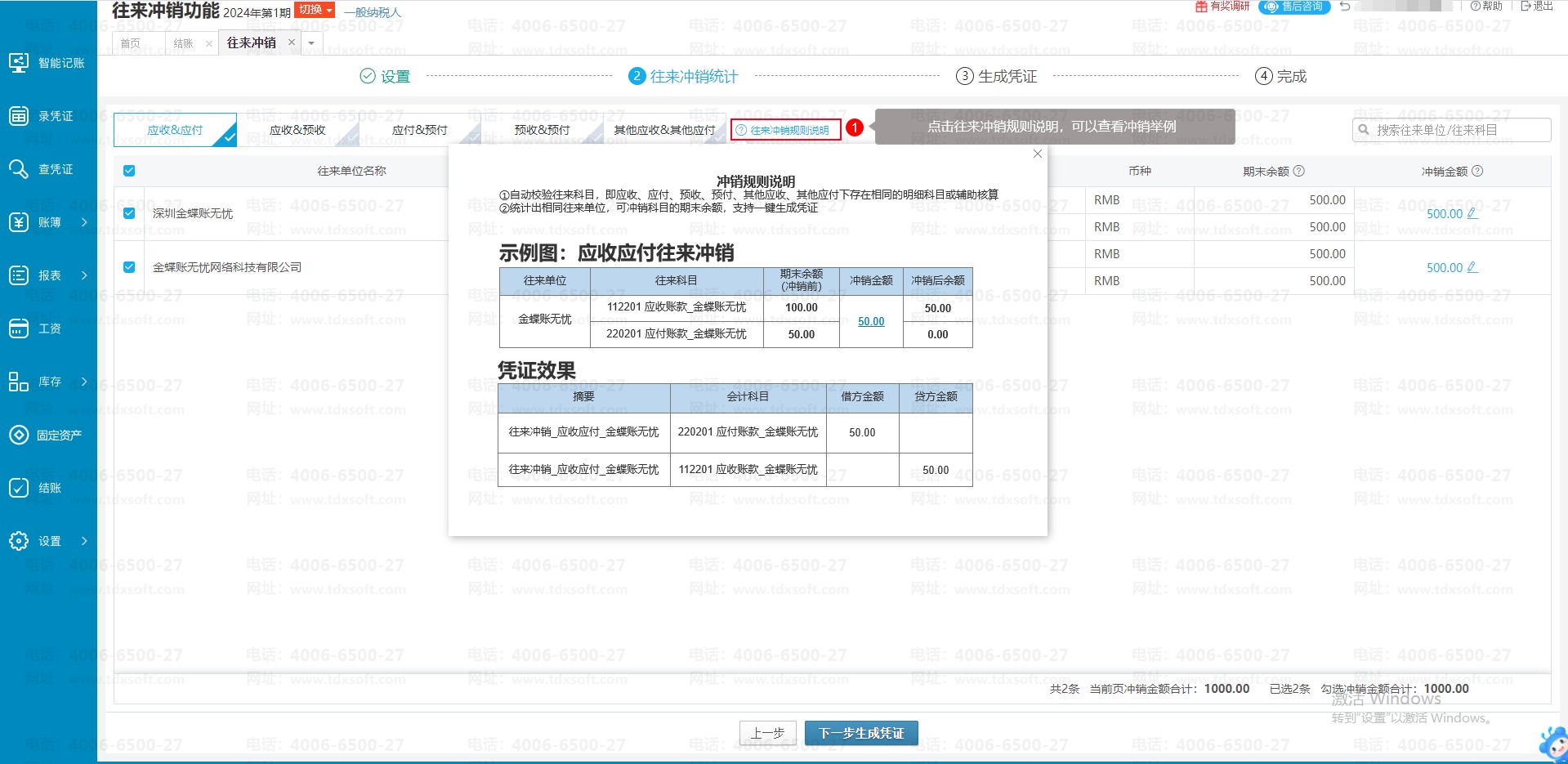 您可以点击往来规则规则说明,查看冲销的举例,便于您使用功能: