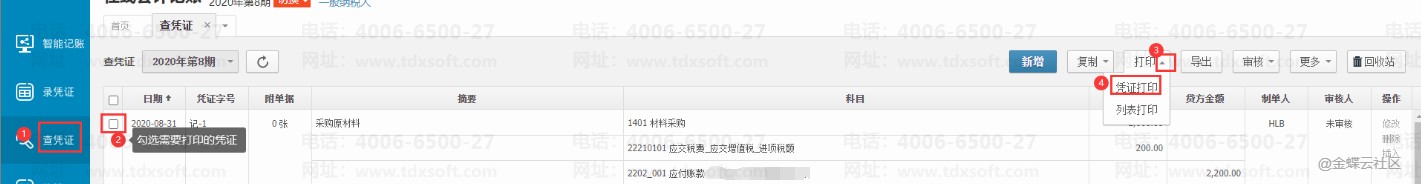 1、进账套点击【查凭证】,勾选好凭证,点击【打印】→【凭证打印】,选择【专业套打】,选择的模板为【金蝶配套金额记账凭证模板(激光_喷墨210mm_140mm】,具体设置如下,如果没安装套打工具,需要先下载并安装;