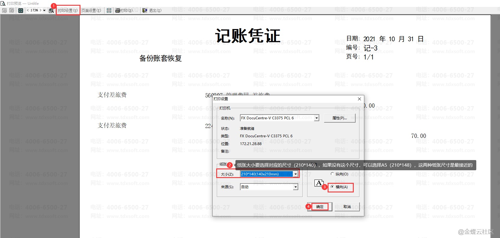2、到打印预览界面,左上角点击【打印设置】,选210*140的尺寸,如果没有,也可以试试A5效果,或在打印机连接的那台电脑主机新增自定义尺寸后再进行选择打印(注意:共享电脑不可以新增纸张)