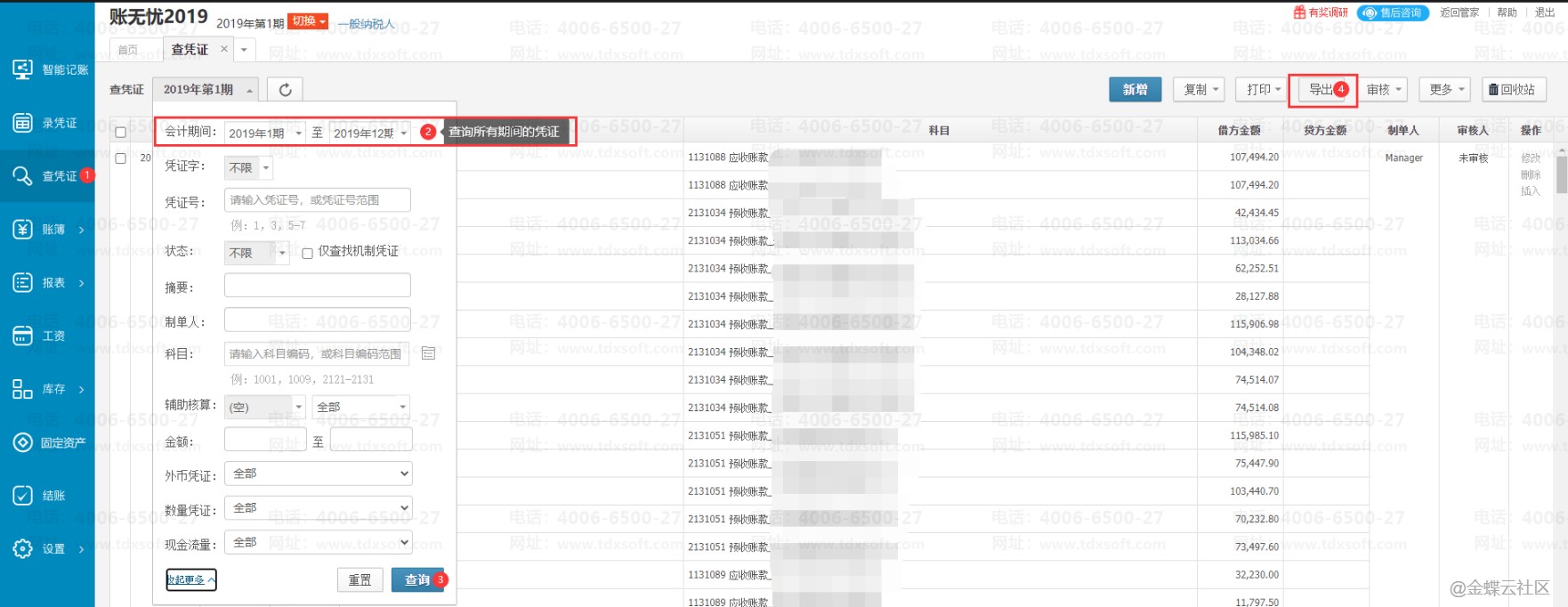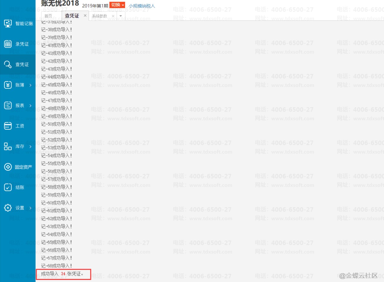 3)进入“账无忧2019”的账套,在【查凭证】界面导出该账套所有期间的凭证数据,再导入到“账无忧2018”的账套