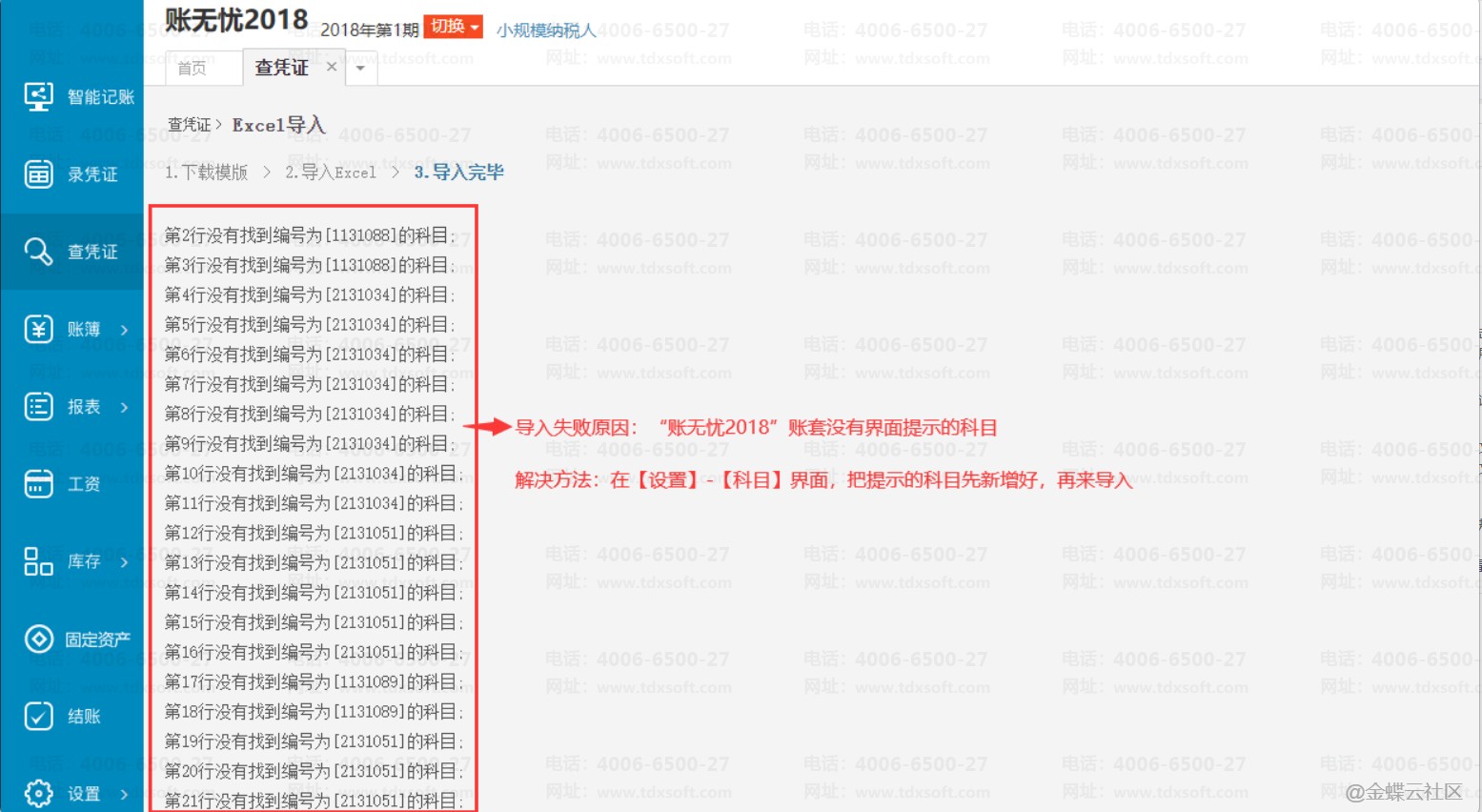 若操作失败返回下图提示语,表示“账无忧2018”账套没有提示的科目,需要先新增科目再来做导入的操作