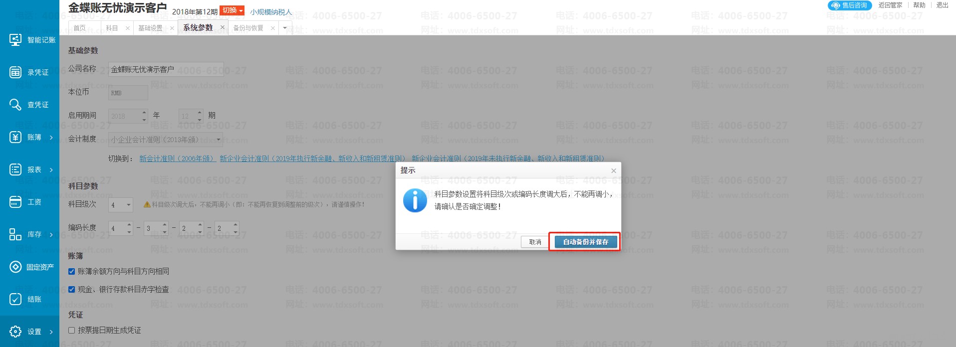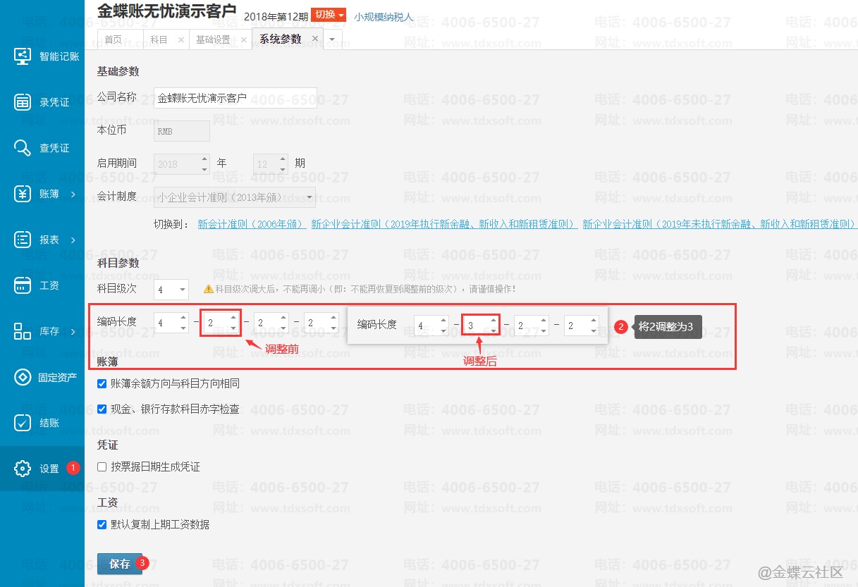 2)将2级科目的编码长度从2改成3,再点击【保存】(其他参数都不需要调整)