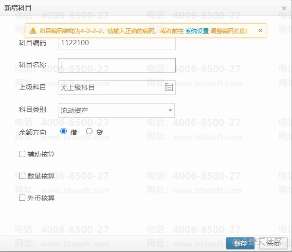 按上图举例,112299科目的编码长度结构为4-2(1122是一级科目4位数,99是二级科目2位数),当二级科目满99位,需要增大一位数使编码结构调整为4-3,才能添加1122100,且最大能新增到1122999