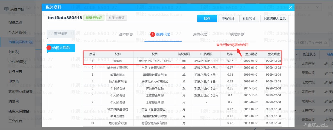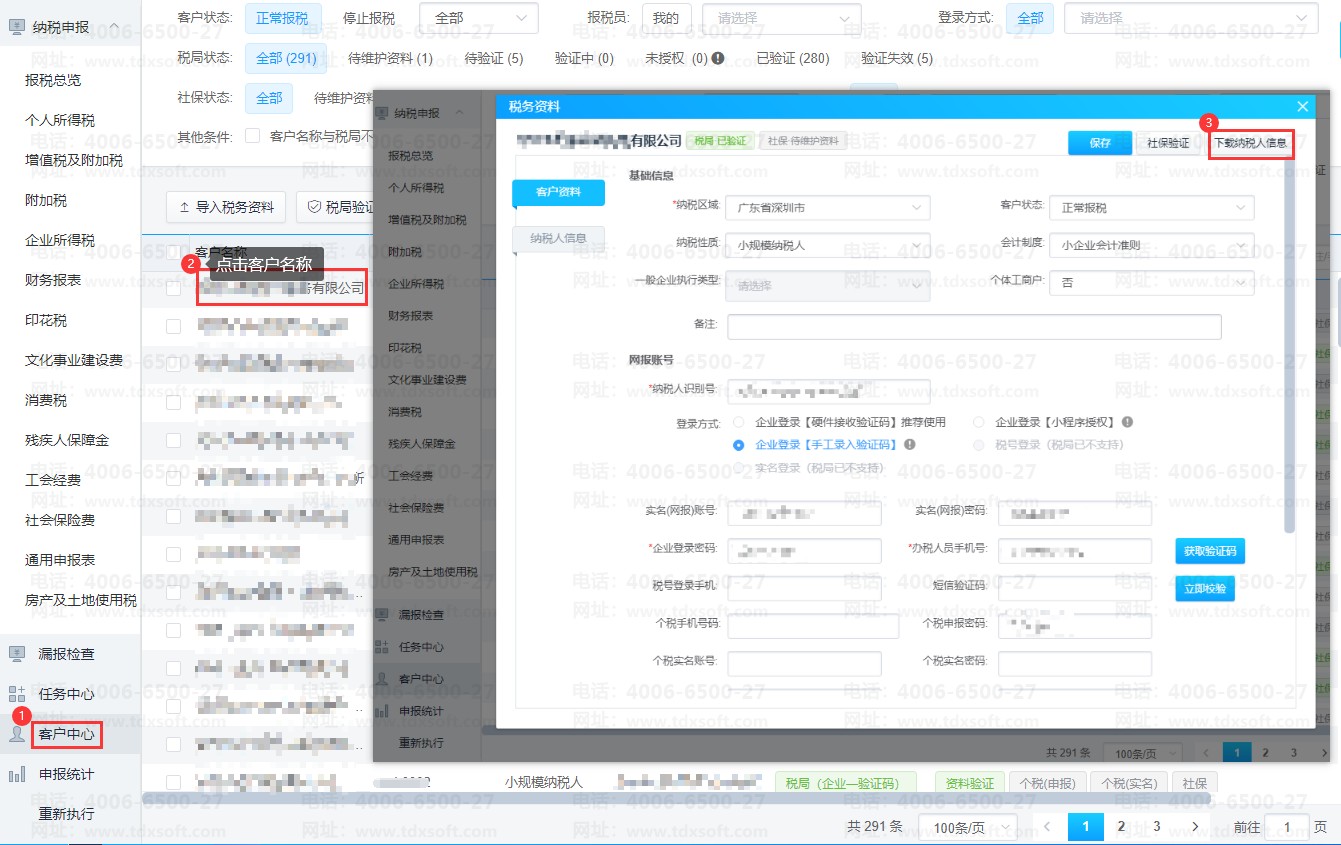 2)在电子税局操作完成后,需要在智能税务中,点开客户名称,操作下载纳税人信息,下载完成后将已启用的税种数据获取到智能税务中后,即可操作申报