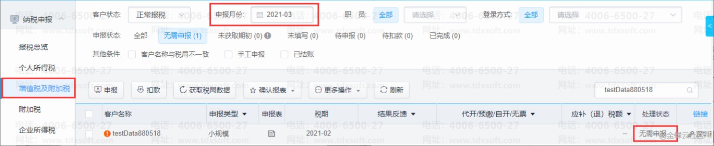 例:A公司为小规模纳税人,增值税申报期限为每年的1/4/7/10月份,当查看月份不是以上4个月份,增值税会显示为无需申报状态