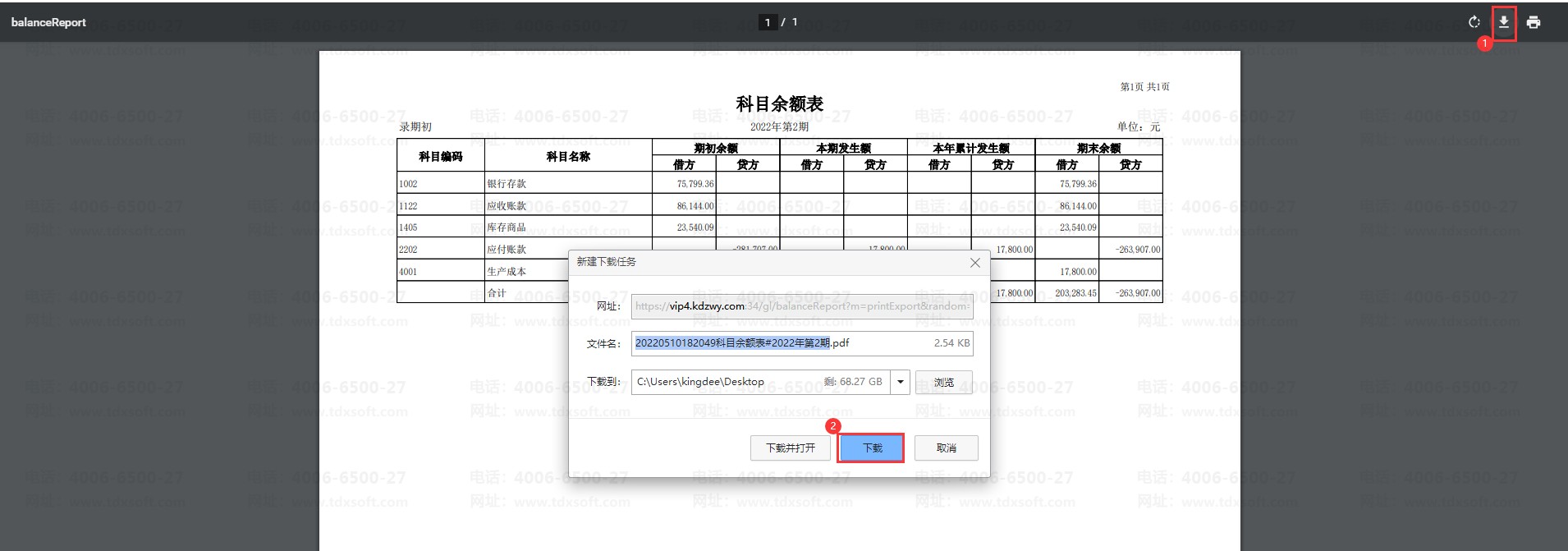 导出pdf格式的科目余额表,需要通过打印界面来操作。点击【账簿】→【科目余额表】,进入科目余额表界面,点击右上角的【打印】按钮进入打印预览界面,在弹出的打印预览界面,鼠标移到右上方点击向下的箭头的图标按钮,在浏览器弹出的下载弹窗中点击【保存】按钮,即可导出pdf格式的科目余额表文件。