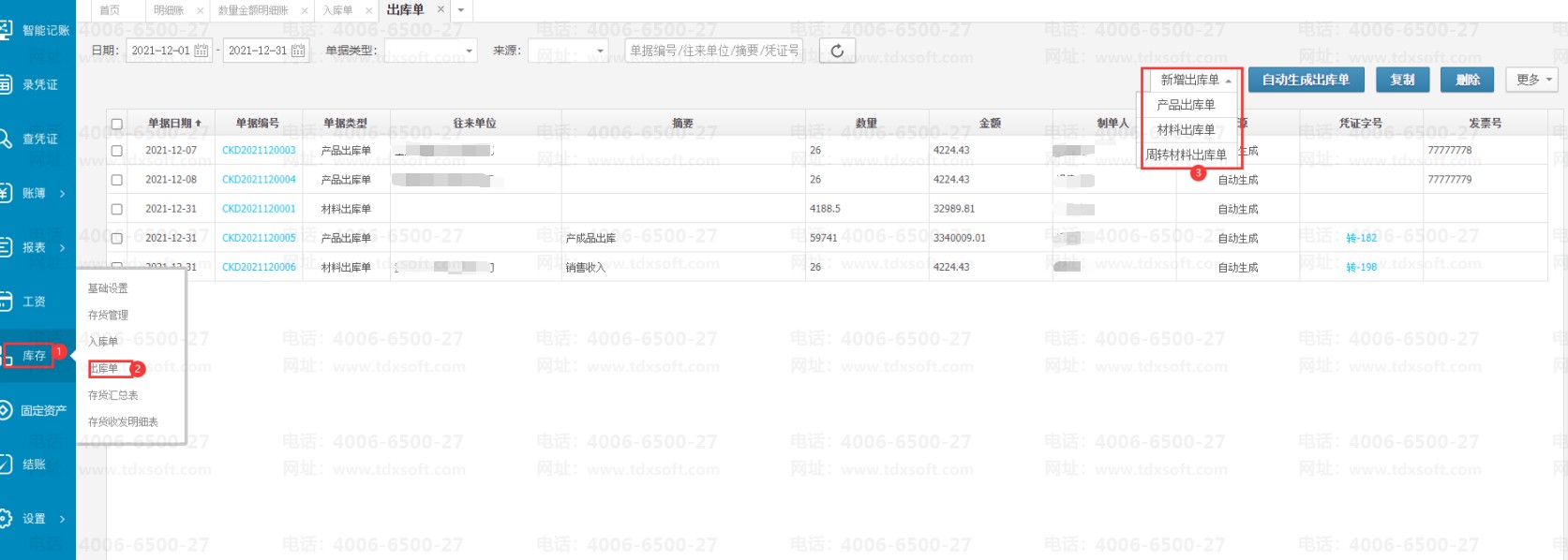 进账簿后点击【库存】→【出库单】,进入出库单界面,点击【新增出库单】按钮,点击对应需要新增的出库单类型,进入新增出库单页面。