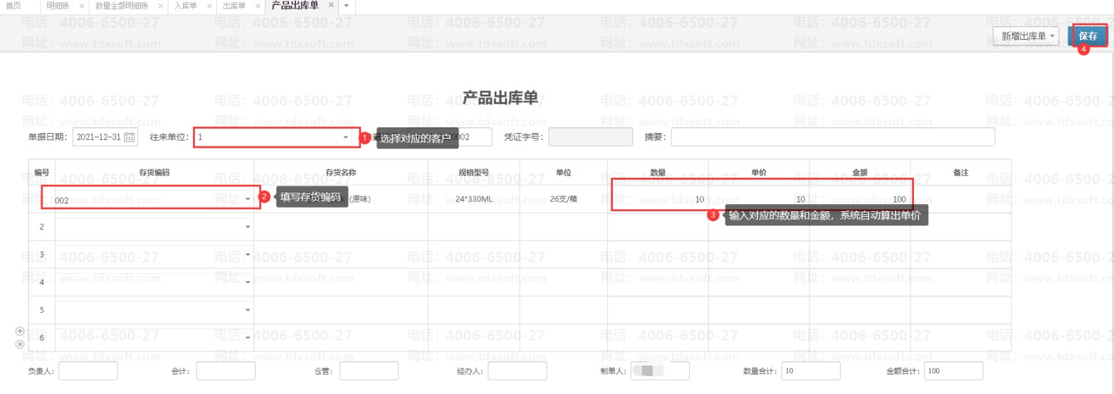 进入出库单填写界面,填写好相关信息,点击【保存】即可。