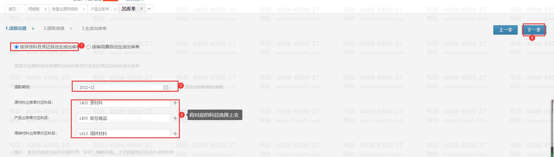 在提取设置界面,选择【按存货科目凭证自动生成出库单】,系统默认提取期间为本期,如需提取后面期间的凭证生成后面期间的出库单,可以进行修改提取期间,再选择需要生成的出库单类型对应的科目,不需要生成的出库单类型对应科目空着即可,不需要全部都选择。设置完成后点击【下一步】进入提取信息界面,系统会根据设置的期间和科目,提取到对应的凭证数据后,勾选需要生成出库单的凭证点击【下一步】,提示“生成成功”即生成出库单成功,可点击出库单单据编号进行查看。