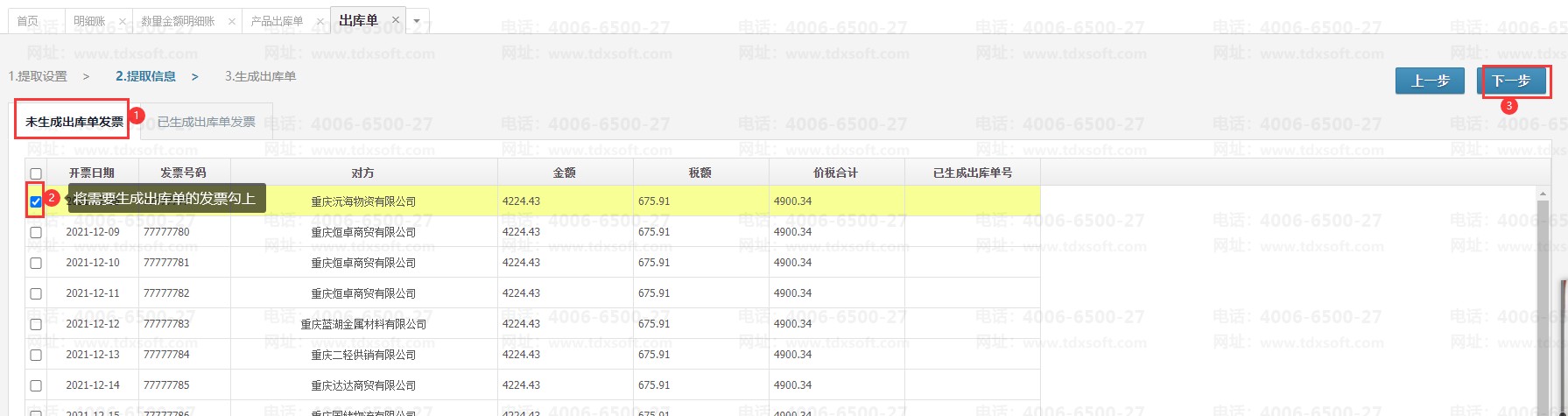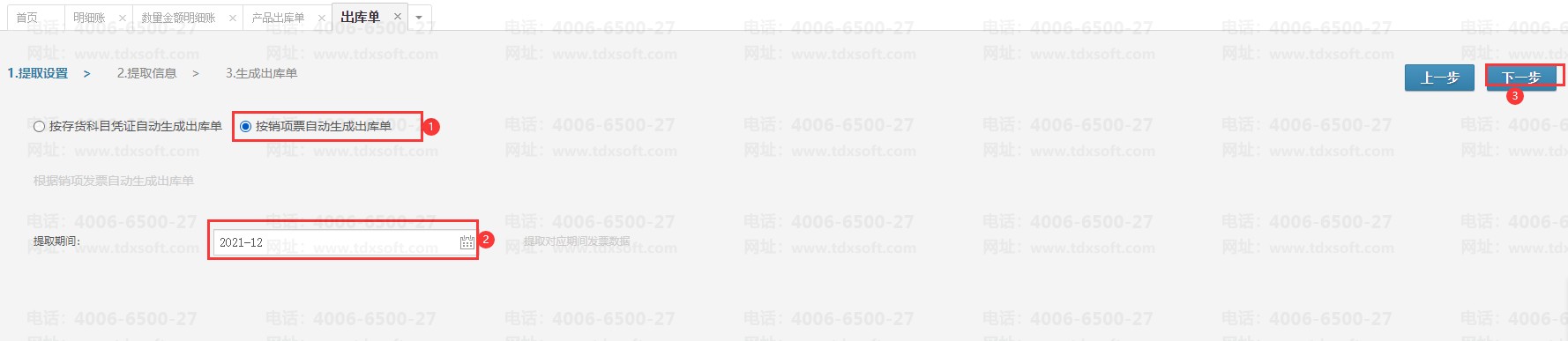 在提取设置界面,点击【按销项票自动生成出库单】,系统默认提取期间为本期,如需提取后面期间的发票可以进行修改,设置完成后点击【下一步】按钮,进入提取信息界面,系统会自动提取智能记账中销项发票开票日期为设置的提取期间的发票数据,在提取信息界面勾选需要生成出库单的发票数据,点击【下一步】即生成出库单成功,可点击出库单单据编号进行查看。