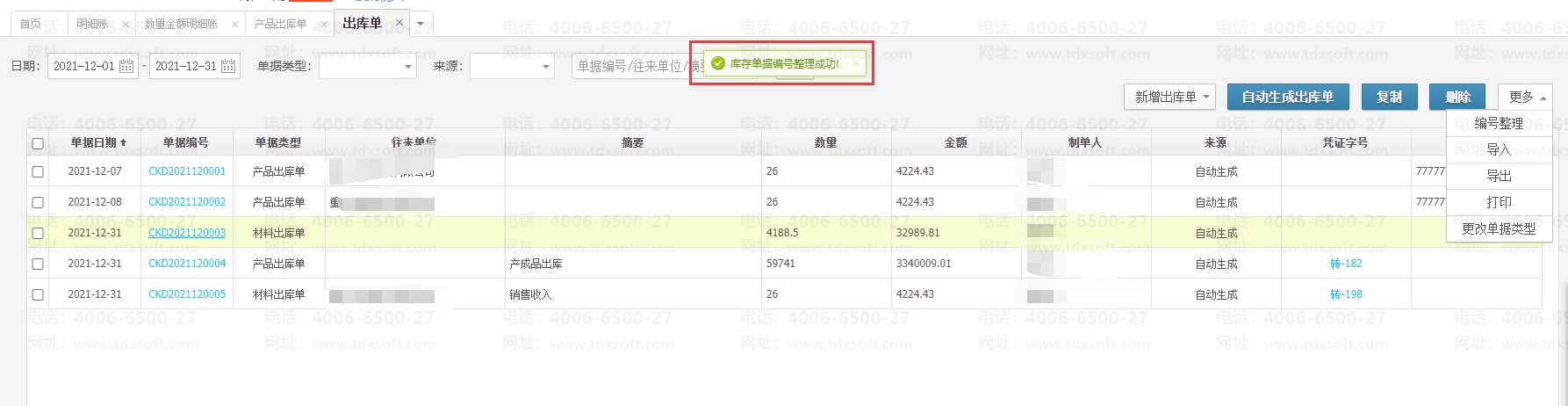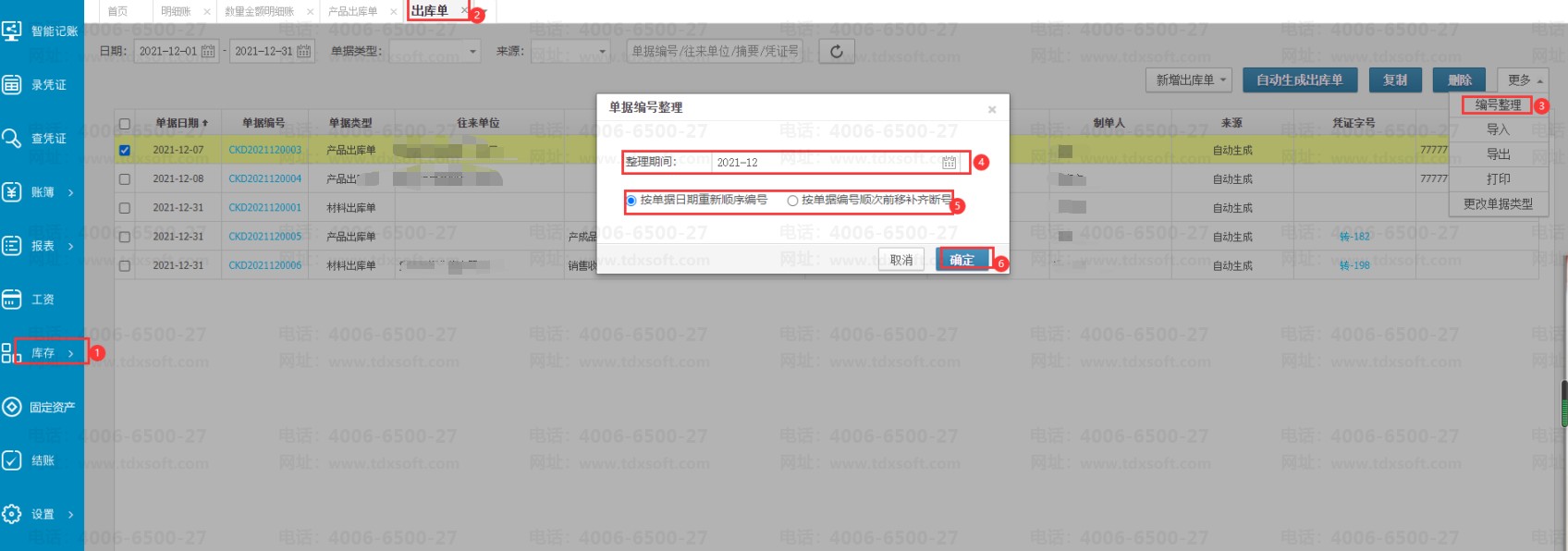 出库单单据编号比较乱或者断号的情况下,可以整理出库单据编号。进账簿后点击【库存】→【出库单】,在出库单界面点击【更多】下的【编号整理】,先选择整理的期间,再选择整理方式,整理方式可以选择【按单据日期重新排序编号】或【按单据编号顺次前移补齐断号】,选择好对应的整理方式后,点击【确认】按钮后,在弹窗提示中选择【自动备份并确认】按钮提示“库存单据编号整理成功“ 即可。