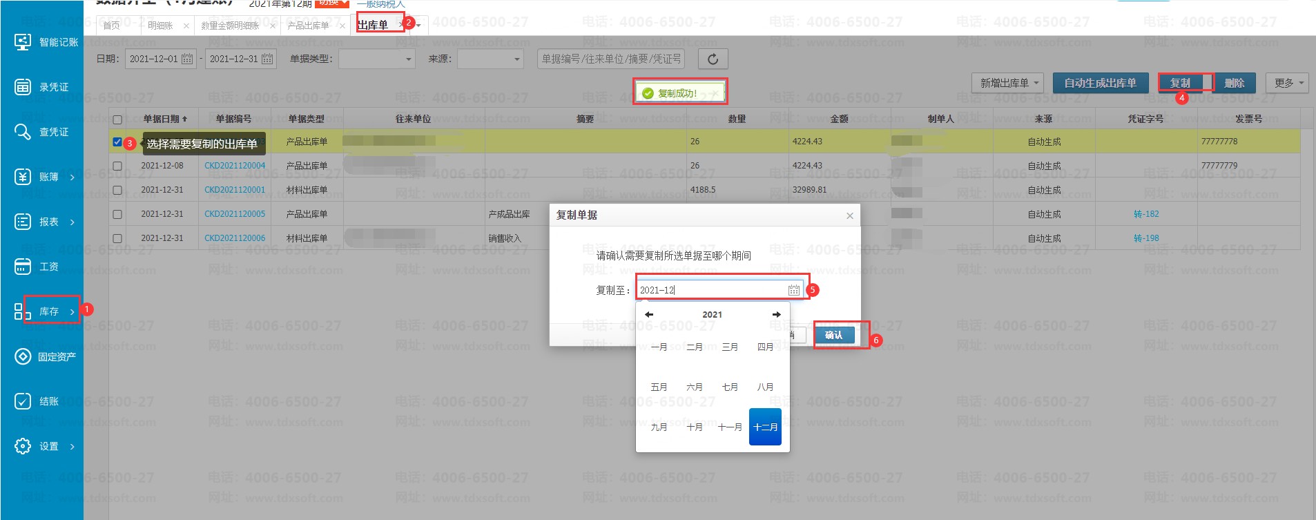 进账簿后,点击【库存】→【出库单】,进入出库单界面勾选需要复制的出库单据,点击【复制】按钮,在复制单据弹窗中,选择复制到哪个期间后,点击【确定】按钮后提示“复制成功”即可。