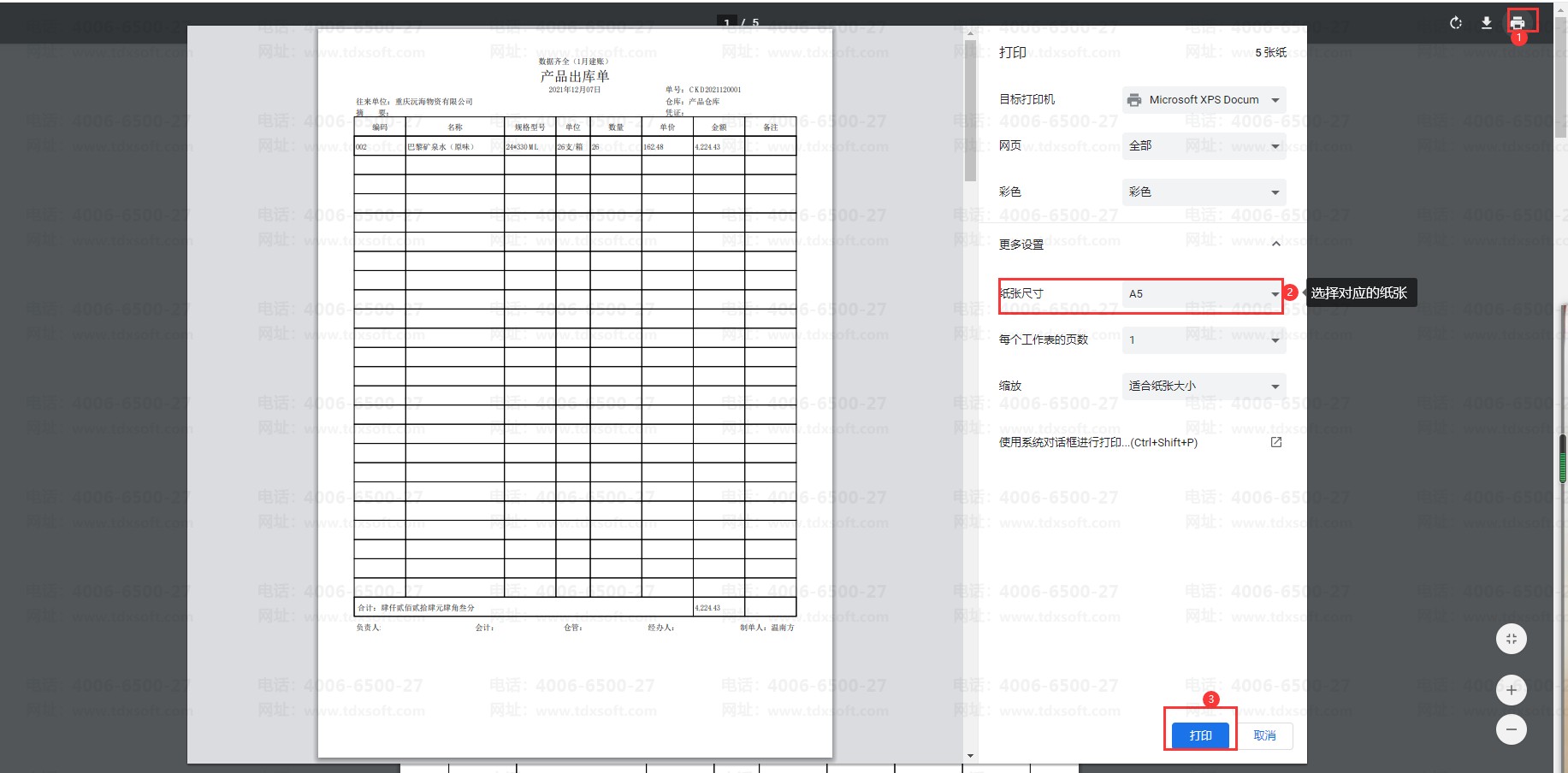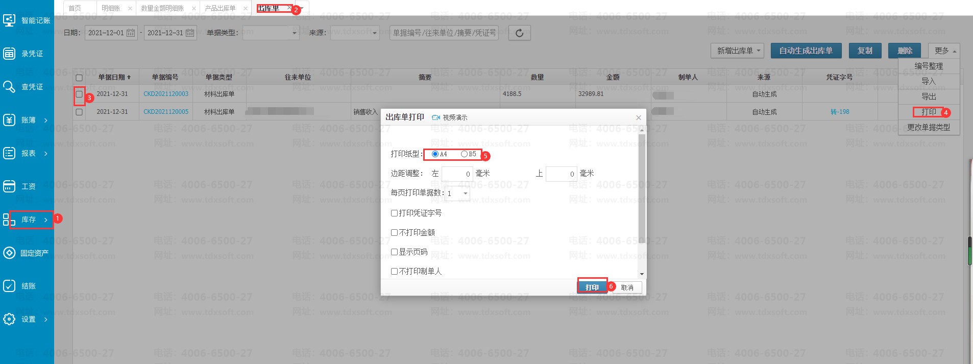 进账簿后点击【库存】→【出库单】,在出库单界面勾上需要打印的出库单,点击【更多】下的【打印】按钮,在出库单打印弹窗中选择需要打印的纸型以及其他的打印设置后,点击【打印】按钮,进入打印预览界面选择好打印机纸张后点击【打印】操作即可。