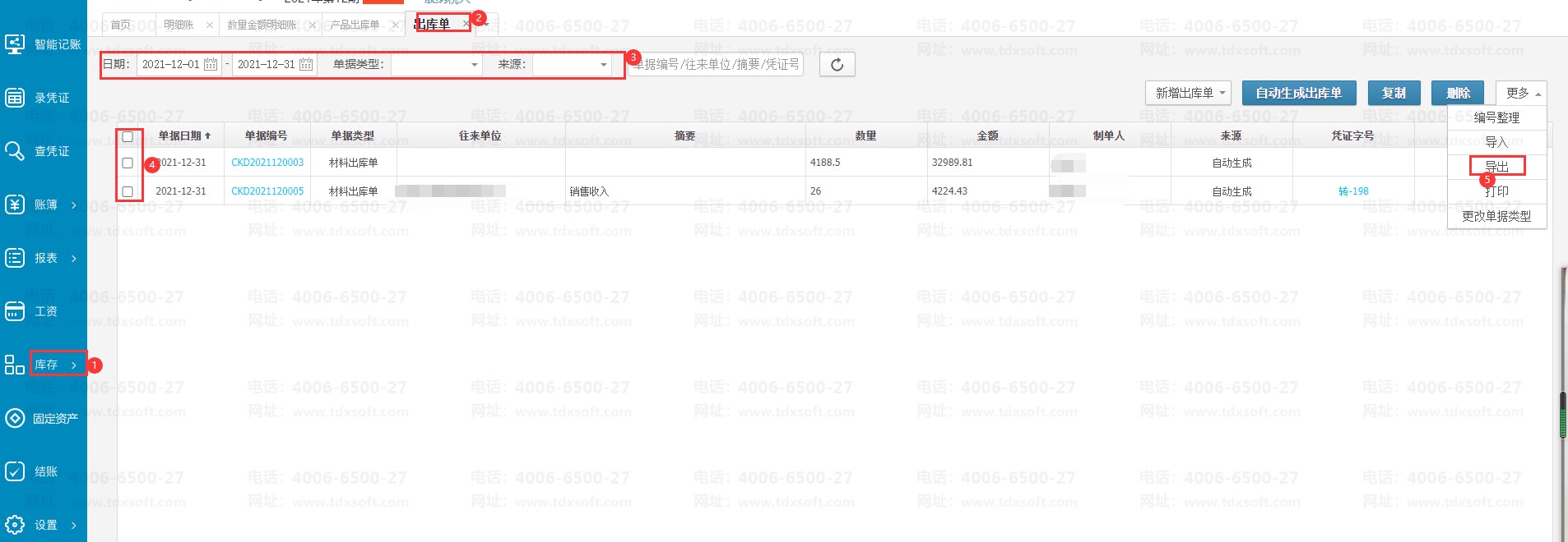 进账簿后点击【库存】→【出库单】,在出库单界面可以筛选需要导出的出库单后,选择需要导出的出库单,点击【更多】下的【导出】按钮会自动导出一个表格文件。如需导出界面上显示的所有出库单,直接点击【导出】按钮即可。