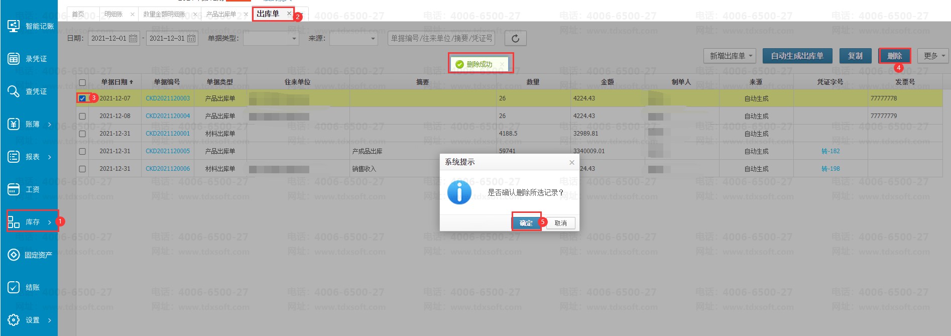进账簿后点击【库存】→【出库单】,在出库单界面选择对应需要删除的出库单,点击【删除】按钮后点击【确认】按钮确认删除,即可成功删除出库单。