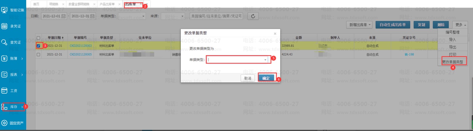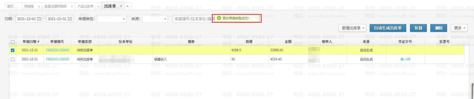 进账簿后点击【库存】→【出库单】,进入出库单界面后,选择需要更改的出库单据,点击【更多】下的【更改单据类型】按钮,选择需要的单据类型后,点击【确定】按钮提示“更改单据类型成功”即可修改成功。