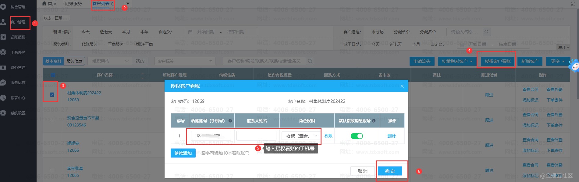 1、代账公司员工操作:打开【客户管理】,勾选相应的客户,点【授权客户看账】,输入客户的手机号后确定(如果这一步之前已经操作,可忽略)