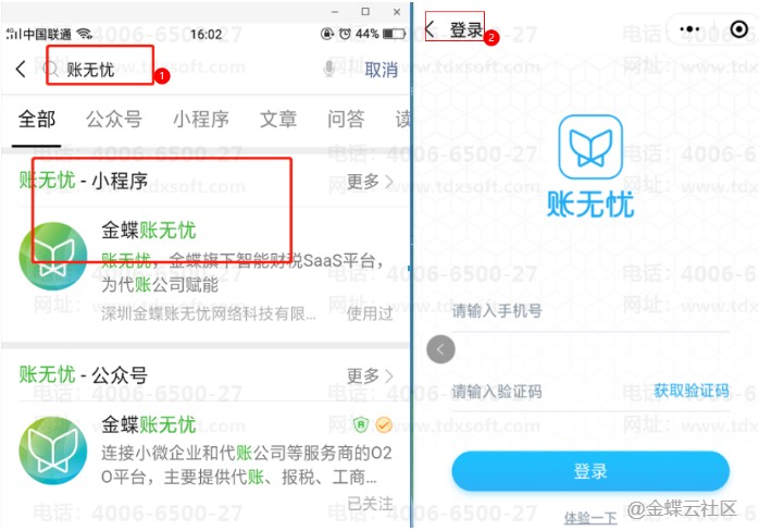 2、企业客户操作:客户搜索“金蝶账无忧”微信小程序,输入手机号,验证码登录