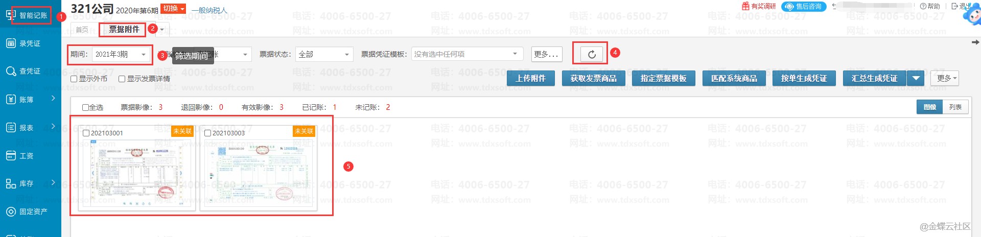 4、代账公司职员操作:客户上传成功后,代账公司进账簿,点击【智能记账】→【理票据】,选择到客户上传发票时选择的期间,即可看到对应的发票。