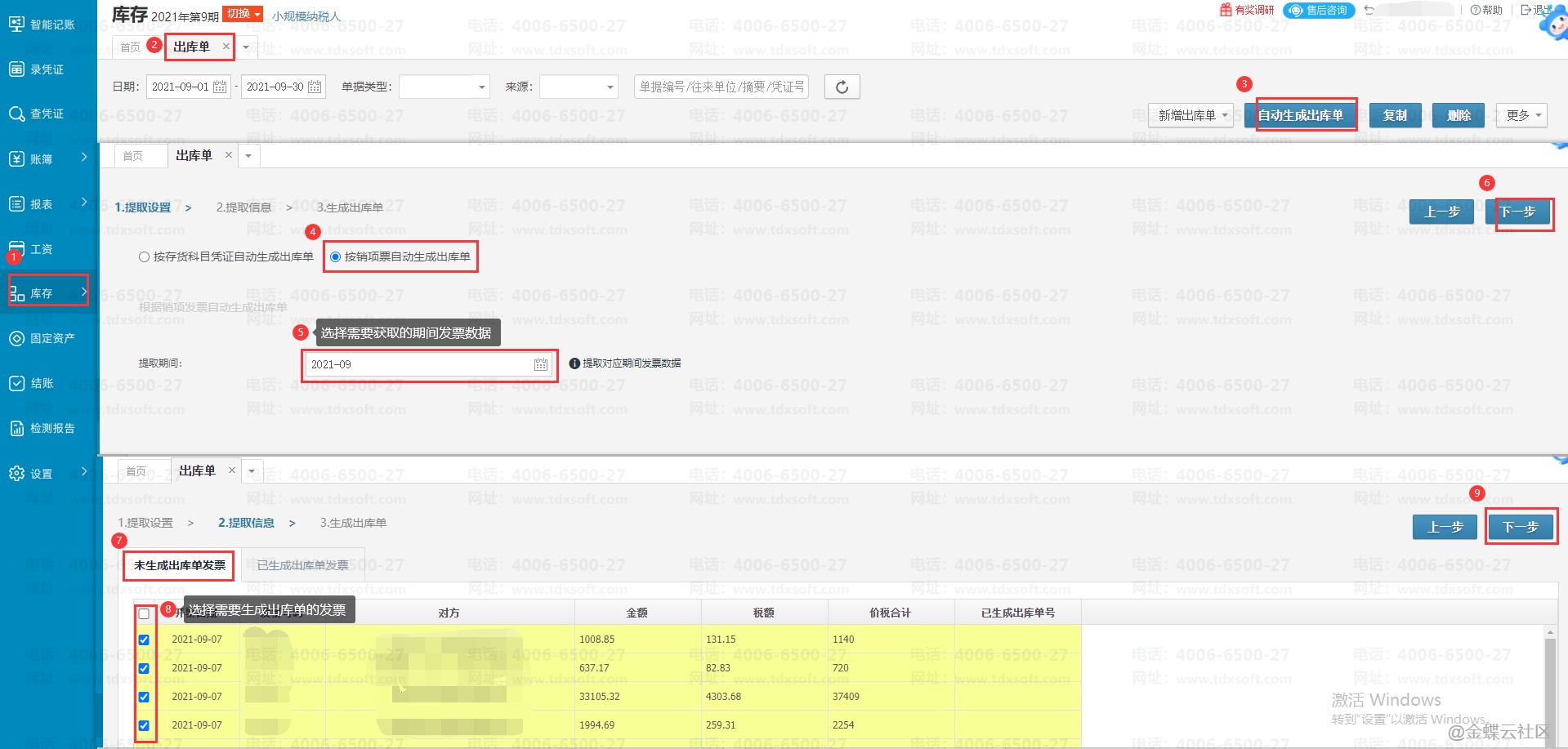 3、显示需要生成的凭证数据后勾选,再点击下一步即可生成出库单。