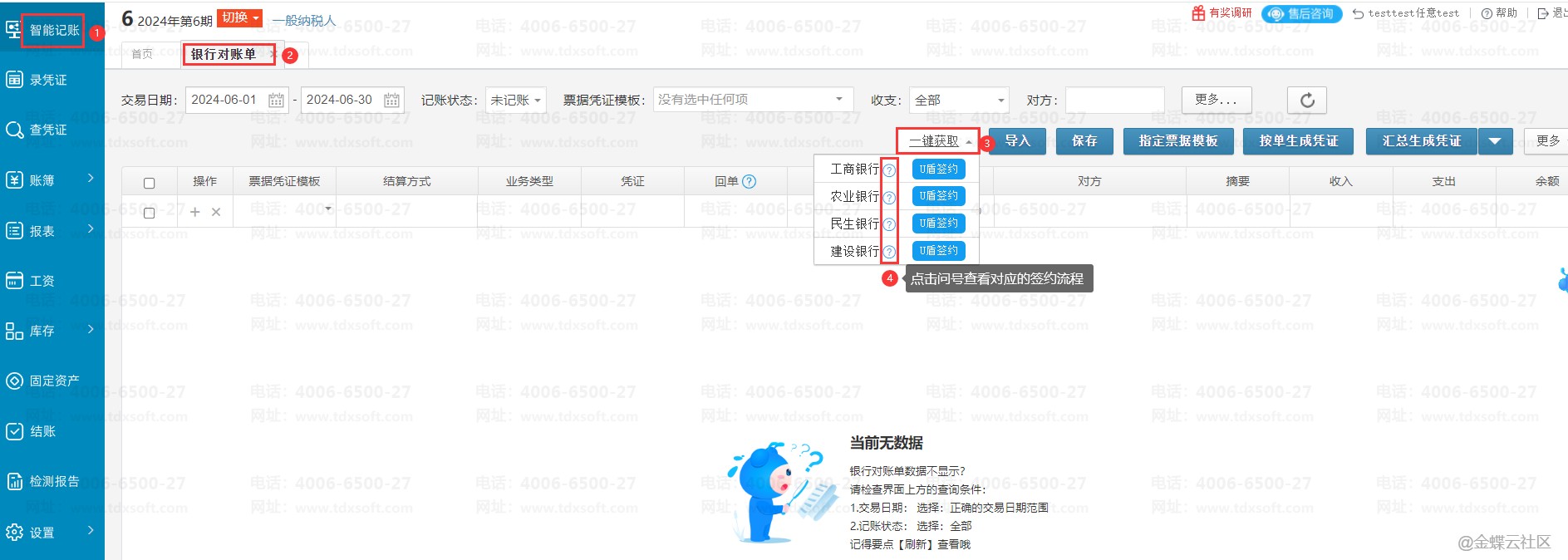 进账簿后,打开【智能记账】 →【银行对账单】 ,在银行对账单界面点击【一键获取】,鼠标点击对应的银行旁问号,即可查看具体的操作流程。