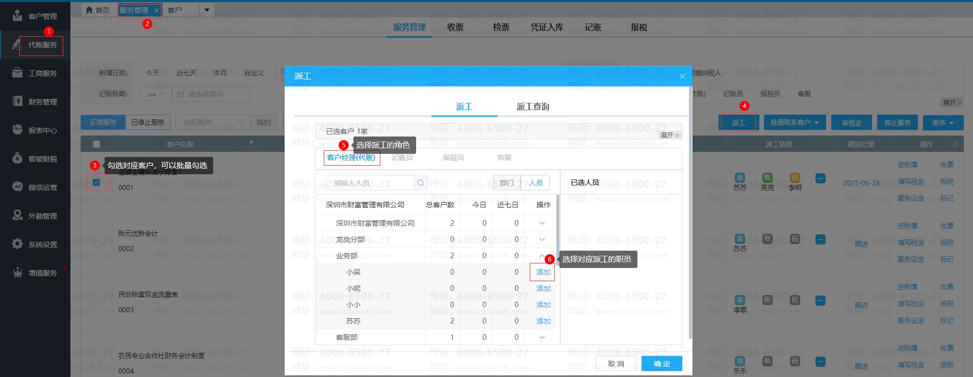 登录管家界面【代账服务】 -- 【服务管理】 -- 【勾选客户】 -- 【派工】,选择需要派工的角色(比如记账员),再选择对应的人员,最后点击【确定】,提示派工成功即可
