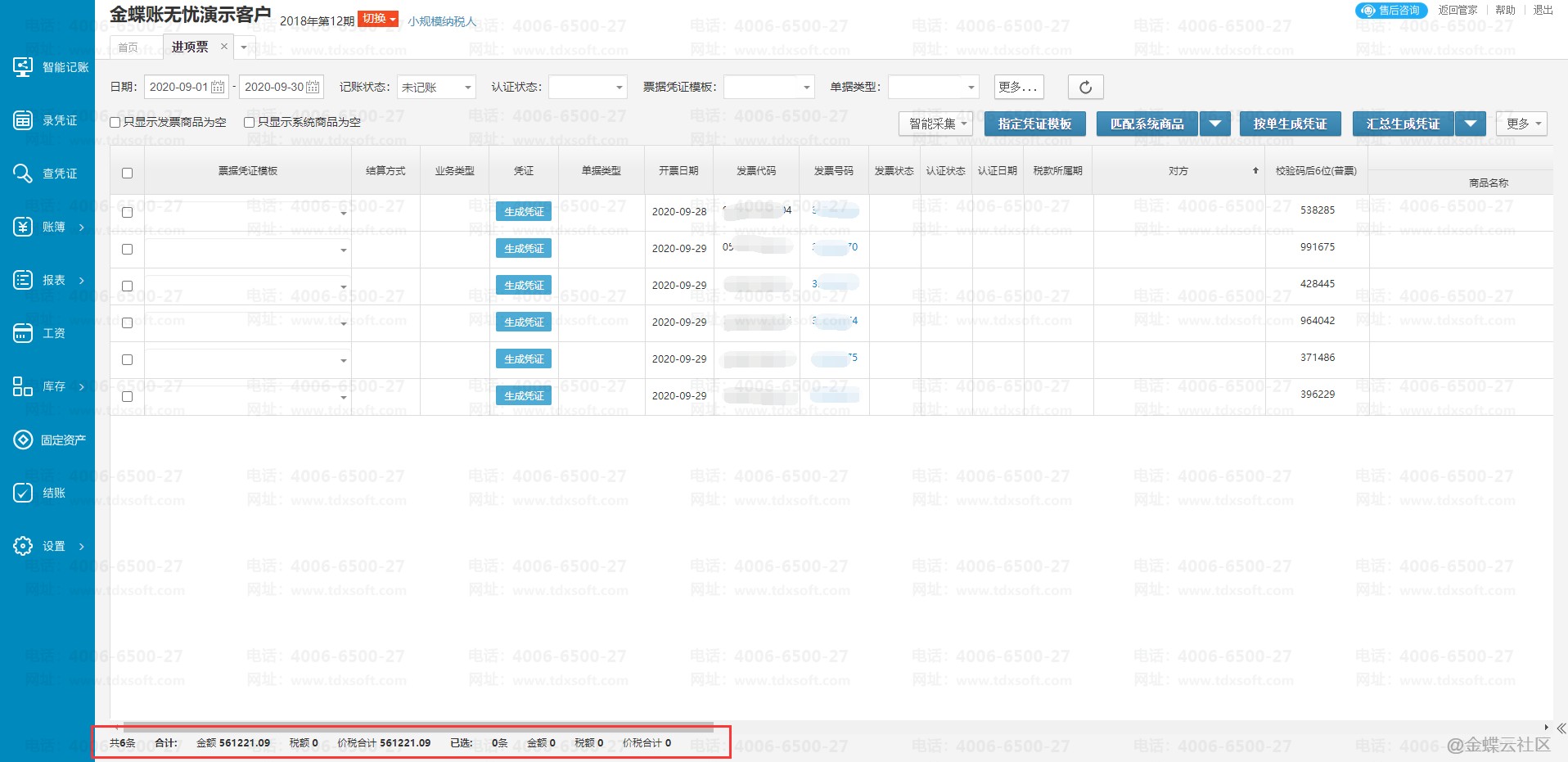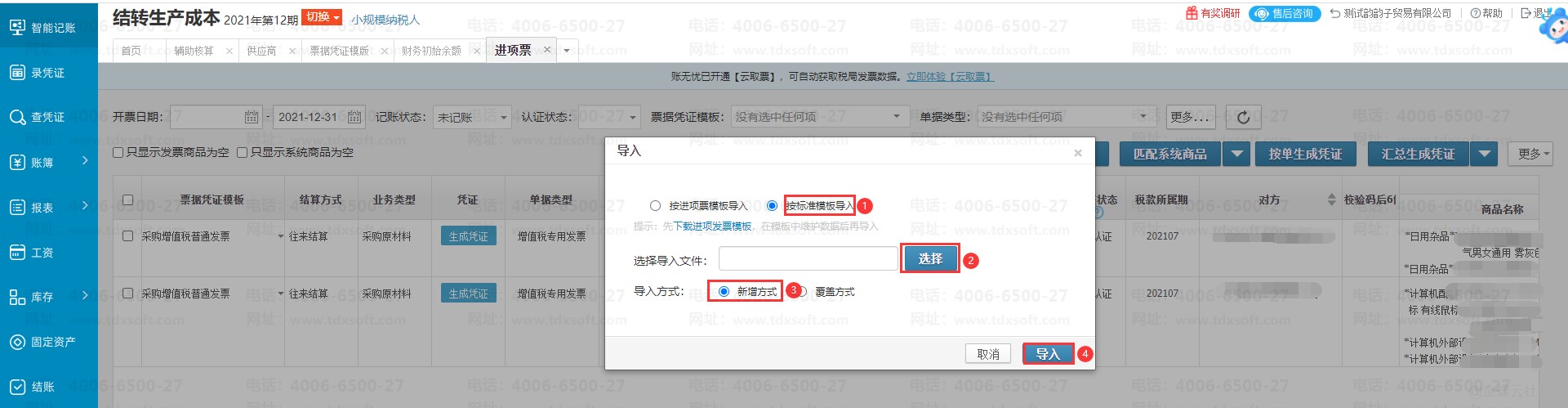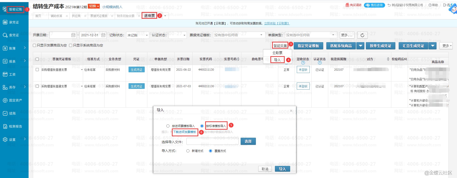 1)进入账套,在【智能记账】→【进项票】→【智能采集】→【导入】→【按标准模板导入】中下载模板