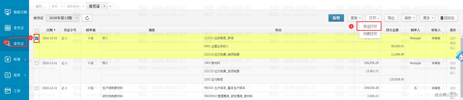 步骤一:点击进账薄点击【查凭证】界面勾选需要打印的凭证,再点击右上角【凭证打印】按钮。