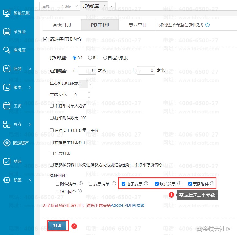 步骤二:点击PDF打印,勾选上【电子票样】/【纸质发票】/【票据附件】,再点击【打印】按钮在打印预览界面可以看到凭证和附件,继续操作打印即可。