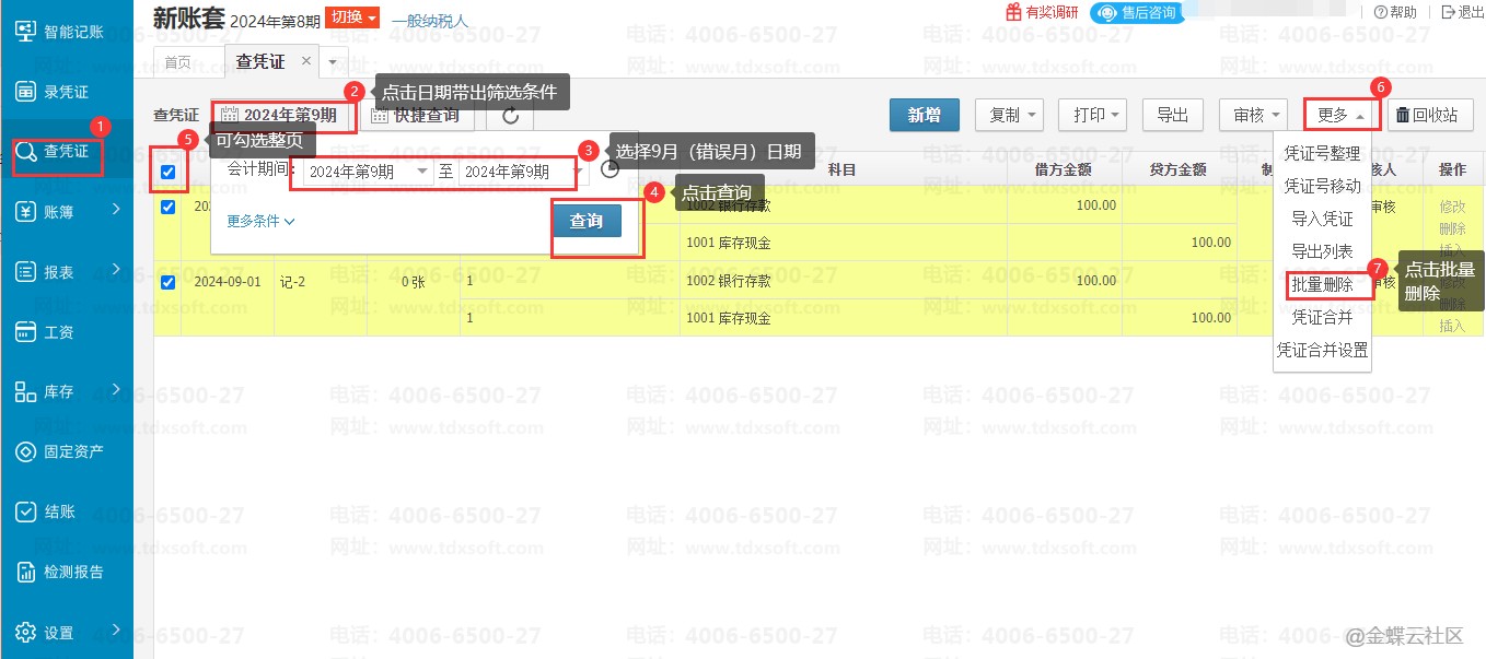 步骤二:删除错误日期的凭证;在查凭证界面筛选错误凭证的【会计期间】,一键全选一页显示的凭证再操作【批量删除】即可。