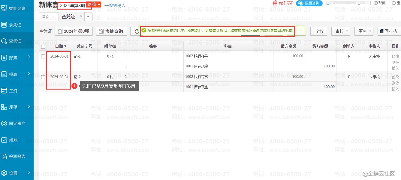 注:期末调汇、计提折旧、结转损益凭证不能直接复制,需要通过结账自动生成!