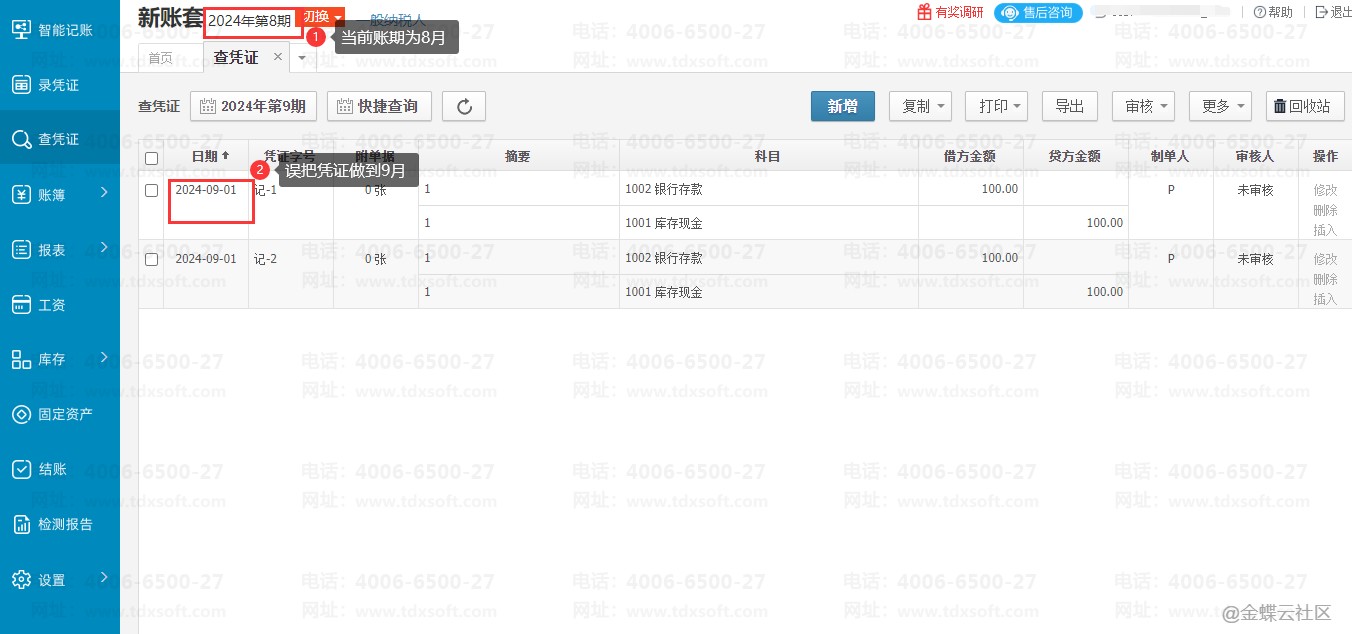 当前做账期间是2024年8月,录凭证的时候,错误的把凭证日期录入到了2024月9月。