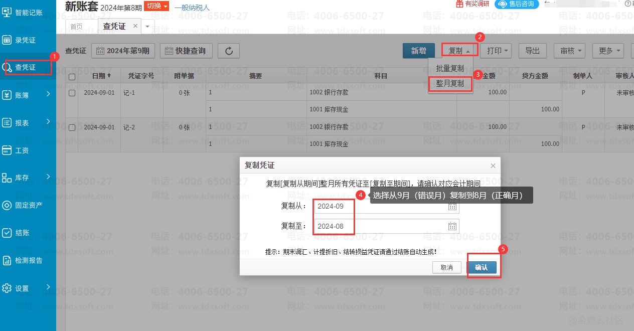步骤一:点击【查凭证】选择右上角【复制】下的【整月复制】按钮,选择好【会计日期】从哪一期复制到哪一期,复制成功之后即可查看到本月有这些凭证了。
