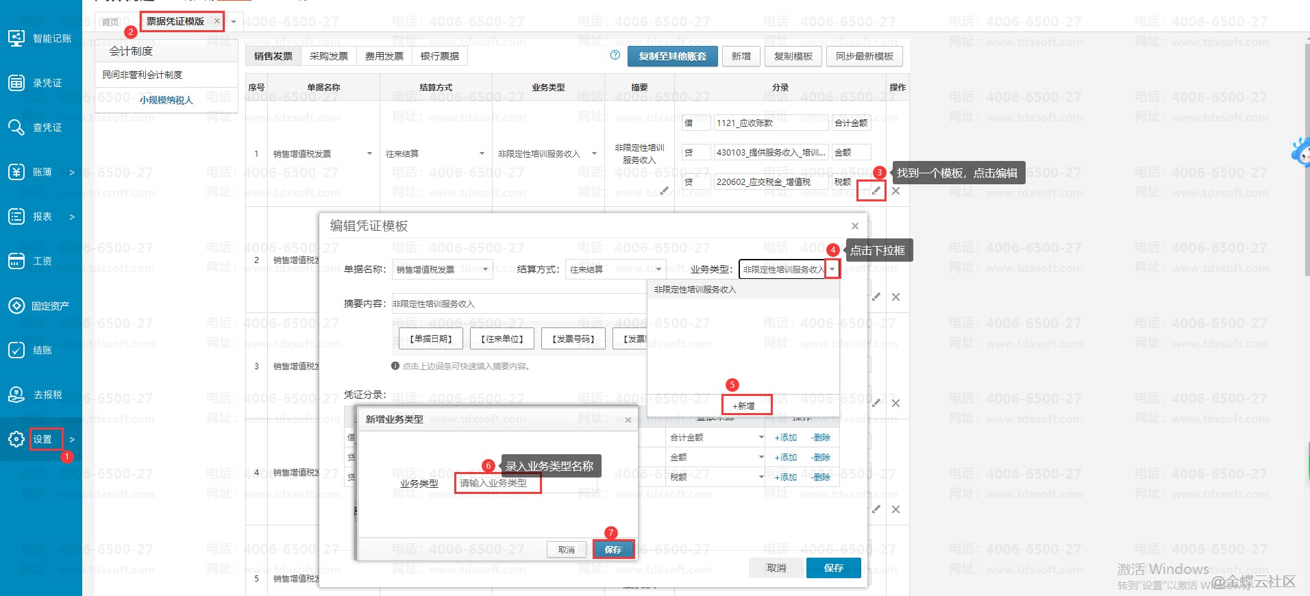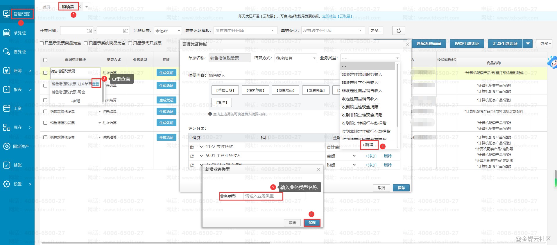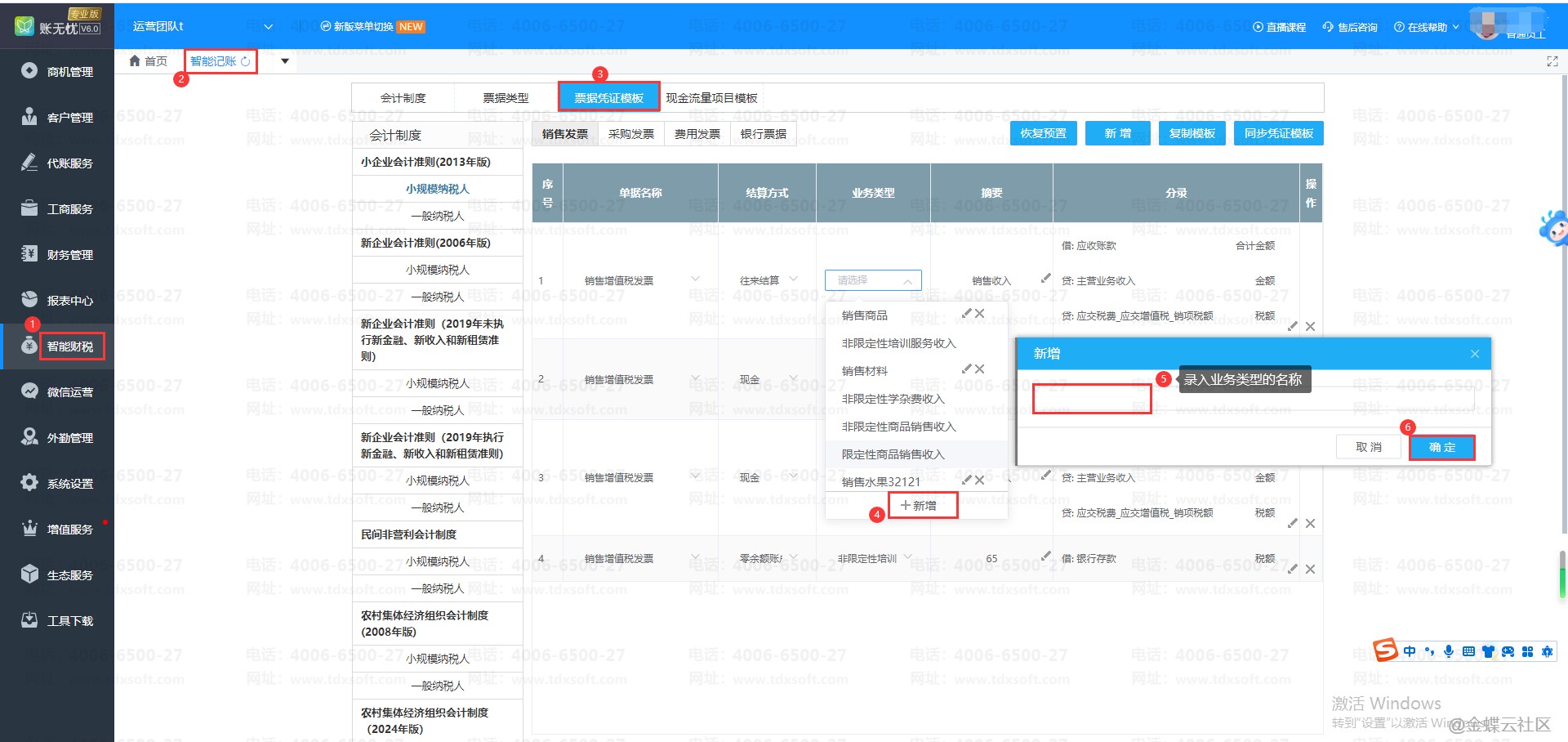 管家界面【智能财税】→【智能记账】 →【票据凭证模板】新增业务类型