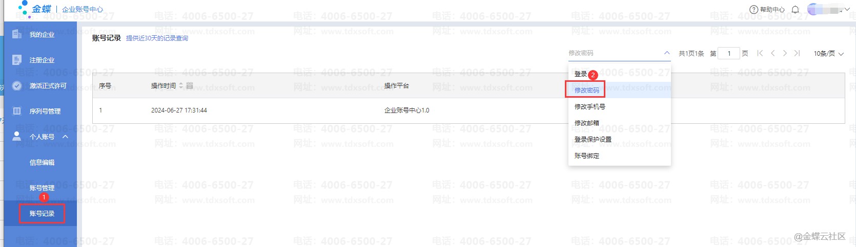 因账无忧产品的登录信息与金蝶云平台通用,若在其他云产品做过账号密码修改记录是会同步更新账无忧的登录信息的,修改记录支持按以下路径登录查询