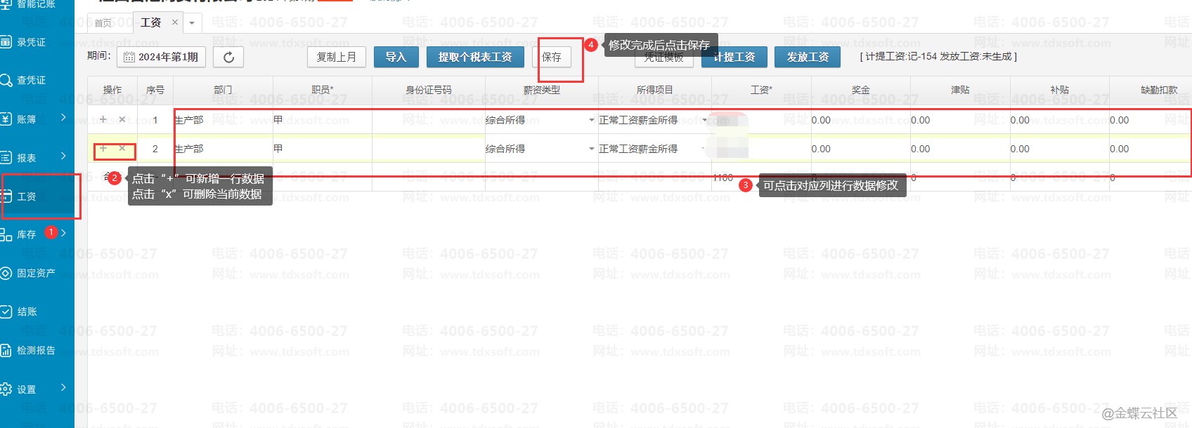 进账簿后,点击【工资】进入工资表界面,可点击“+”和“x”操作新增行数或删除当前数据,也可直接对后面已有的数据进行修改。