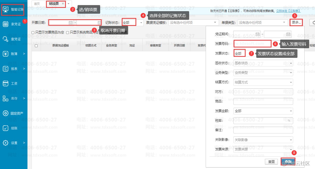 打开账簿,点击【智能记账】→【进/销项票】,避免其他筛选条件限制找不到这张发票,搜索取消【开票日期】,将【记账状态】修改成全部,点击【更多】录入发票号码,发票状态设置成【全部】确认后点击【查询】。