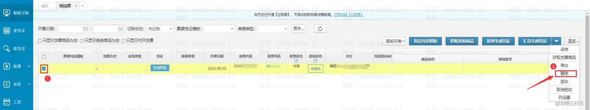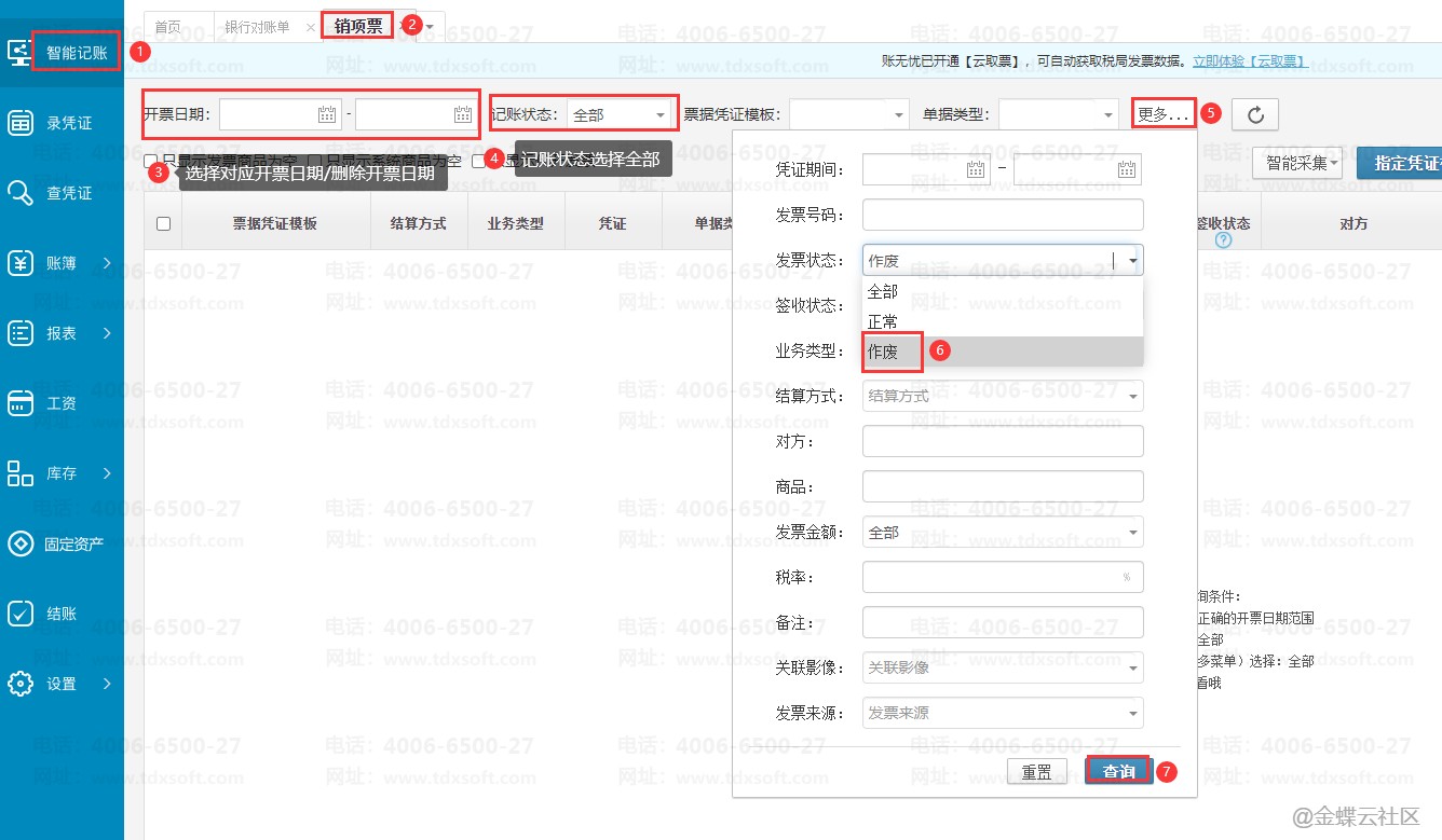 1.进入账簿,点击左侧边栏【智能记账】→【进/销项票】,筛选对应日期或者删除开票日期,记账状态选择【全部】,再点击【更多】→【作废】状态→【查询】。