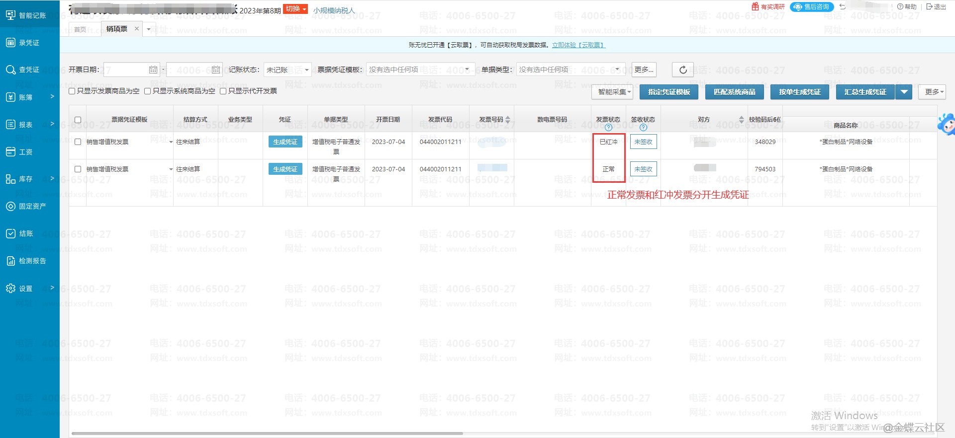 汇总生成凭证时,需要将正常发票和红冲发票分开生成即可