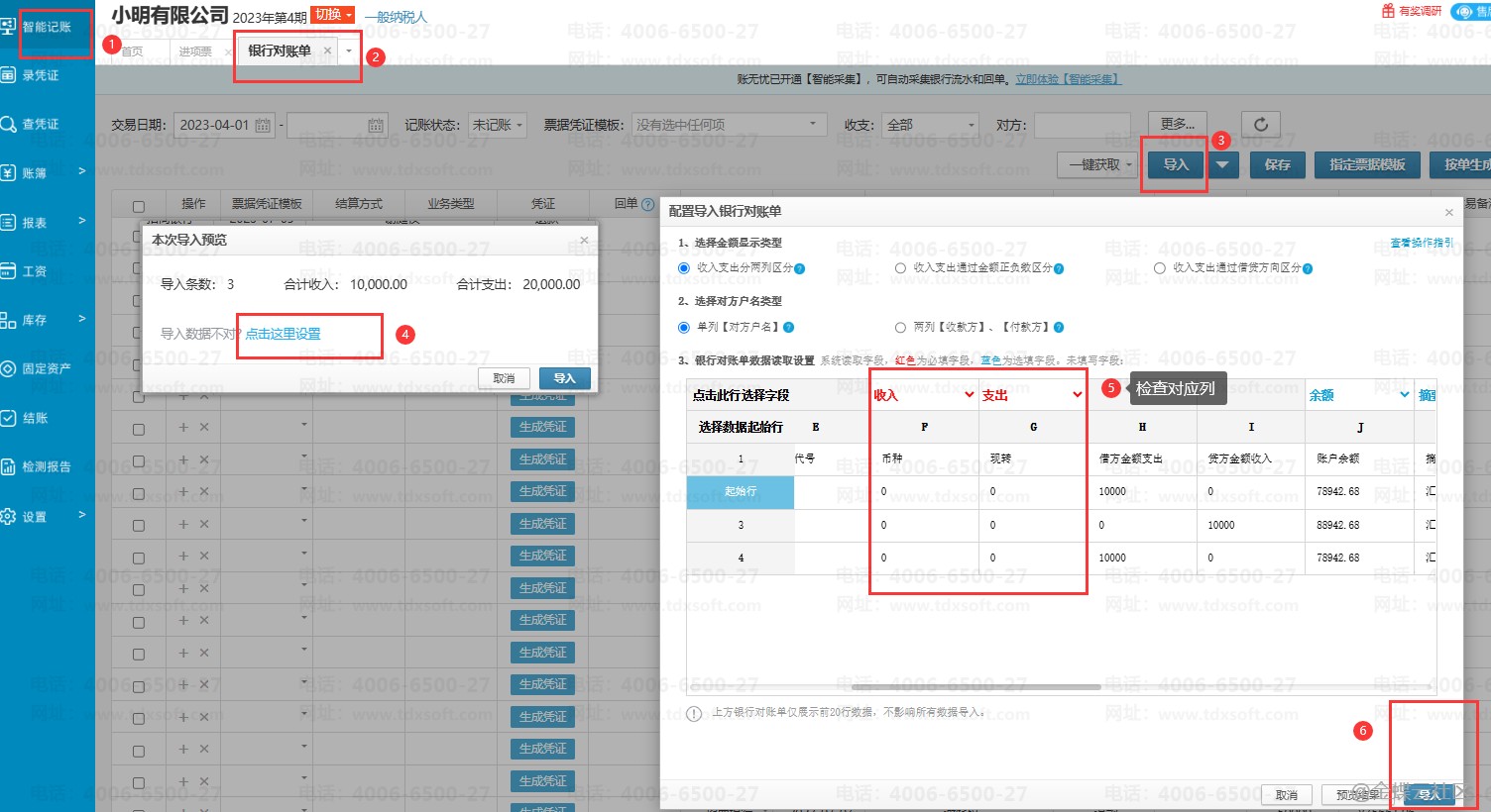 1、银行对账单数据读取设置选择的收入支出列数据是否正确;不正确就修改到对应列后再导入