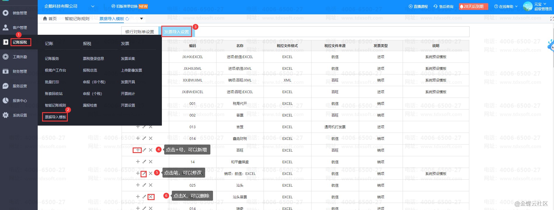 登录账无忧点击【记账报税】→【票据导入模板】,找到相应的进行发票文件模板设置区域,‘’+‘’是新增,‘’x‘’是删除,点一支笔的图标是进入修改即可
