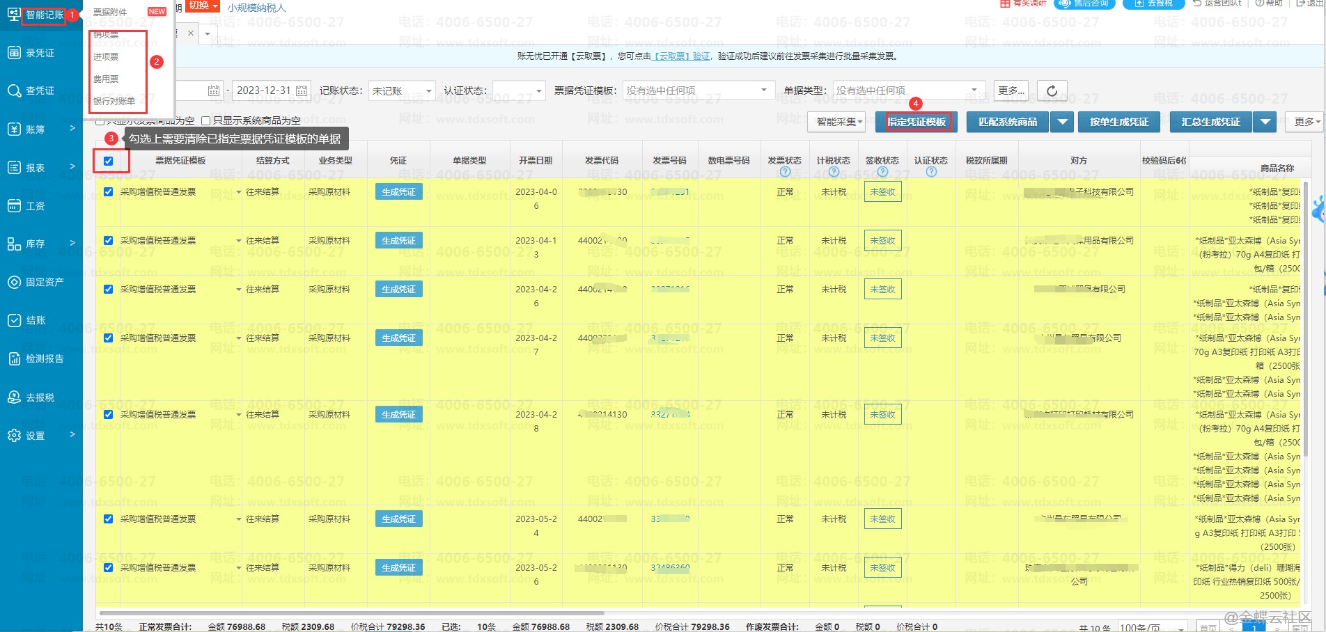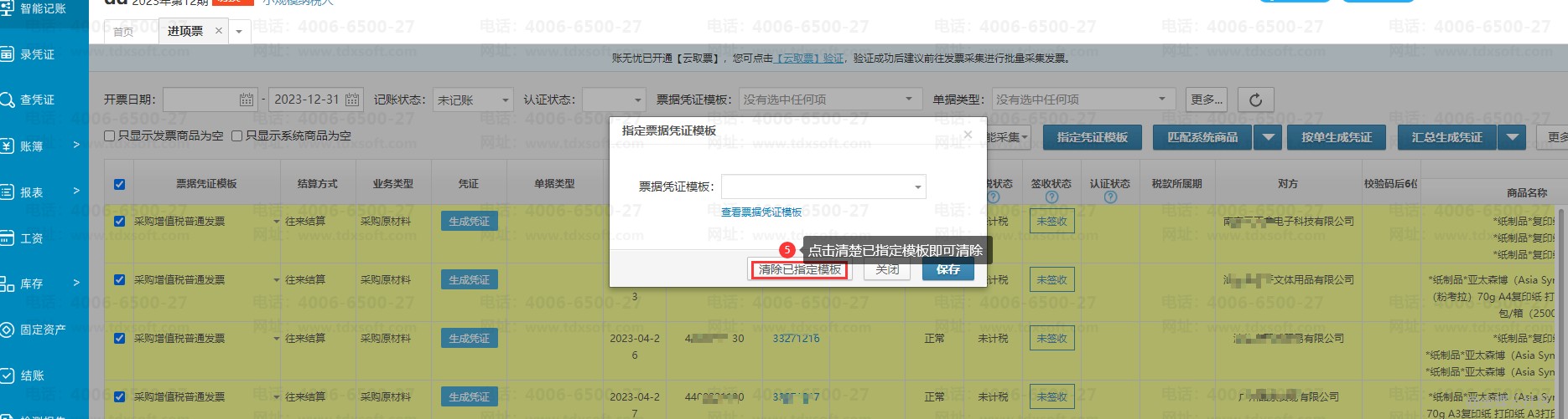 进入账套后点击【智能记账】→【进项票】/[销项票】/[费用票】/[银行对账单】进入界面后,可以勾选上已指定的票据凭证模板单据后点击右上角的【指定票据凭证模板】按钮后再点击一下【清除已指定模板】的按钮操作一下即可。