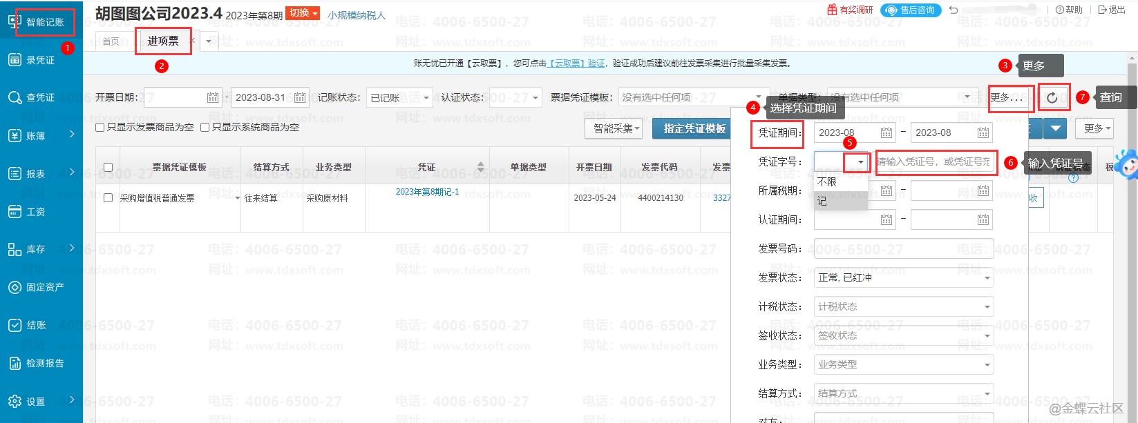 点击【智能记账】→【进项票】,进入进项票界面在筛选条件中点击【更多】,设置需要筛选的凭证期间、凭证字号这些筛选条件后,点击【查询】按钮,即可快速查询出此凭证号对应的是哪些发票。