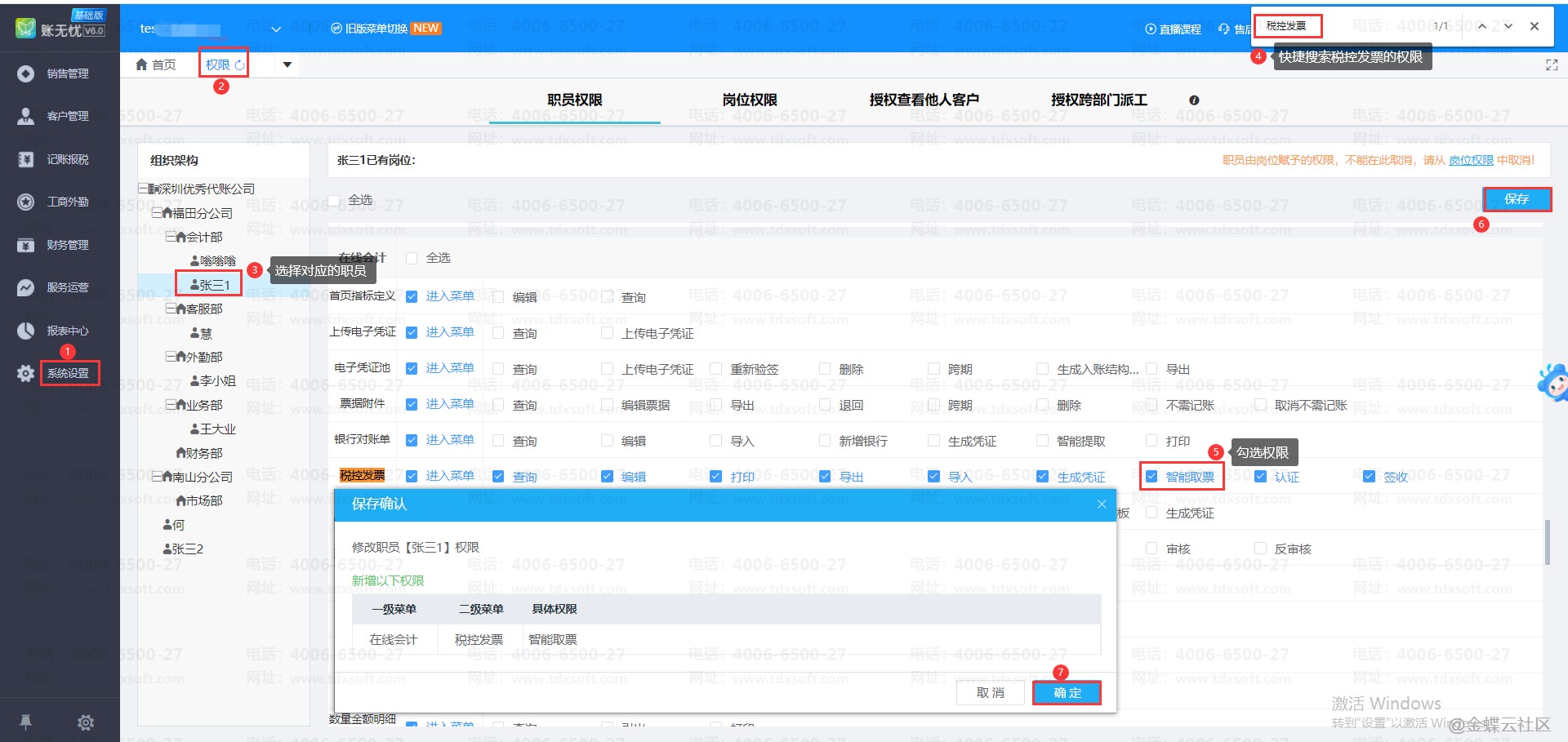 在【系统设置】→【权限】界面,找到对应的职员后,可以在键盘输入【Ctrl+F】键,输入关键词【税控发票】,系统会自动定位到对应的权限位置,勾选【智能取票】的权限,保存设置即可