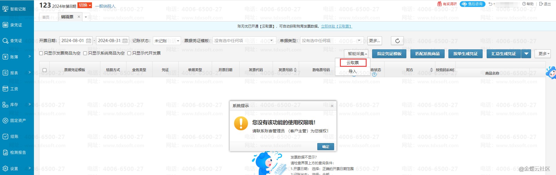 在销项/进项界面,点击【云取票】按钮时弹出没有权限
